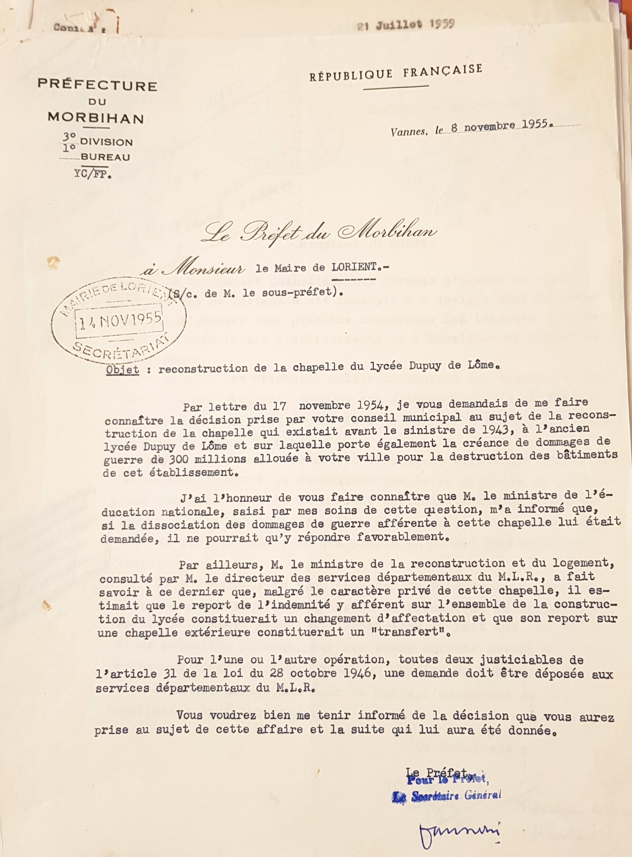 Lettre du préfet du Morbihan au maire de Lorient à propos de la reconstruction de la chapelle du lycée (8/11/1955)Immatriculation