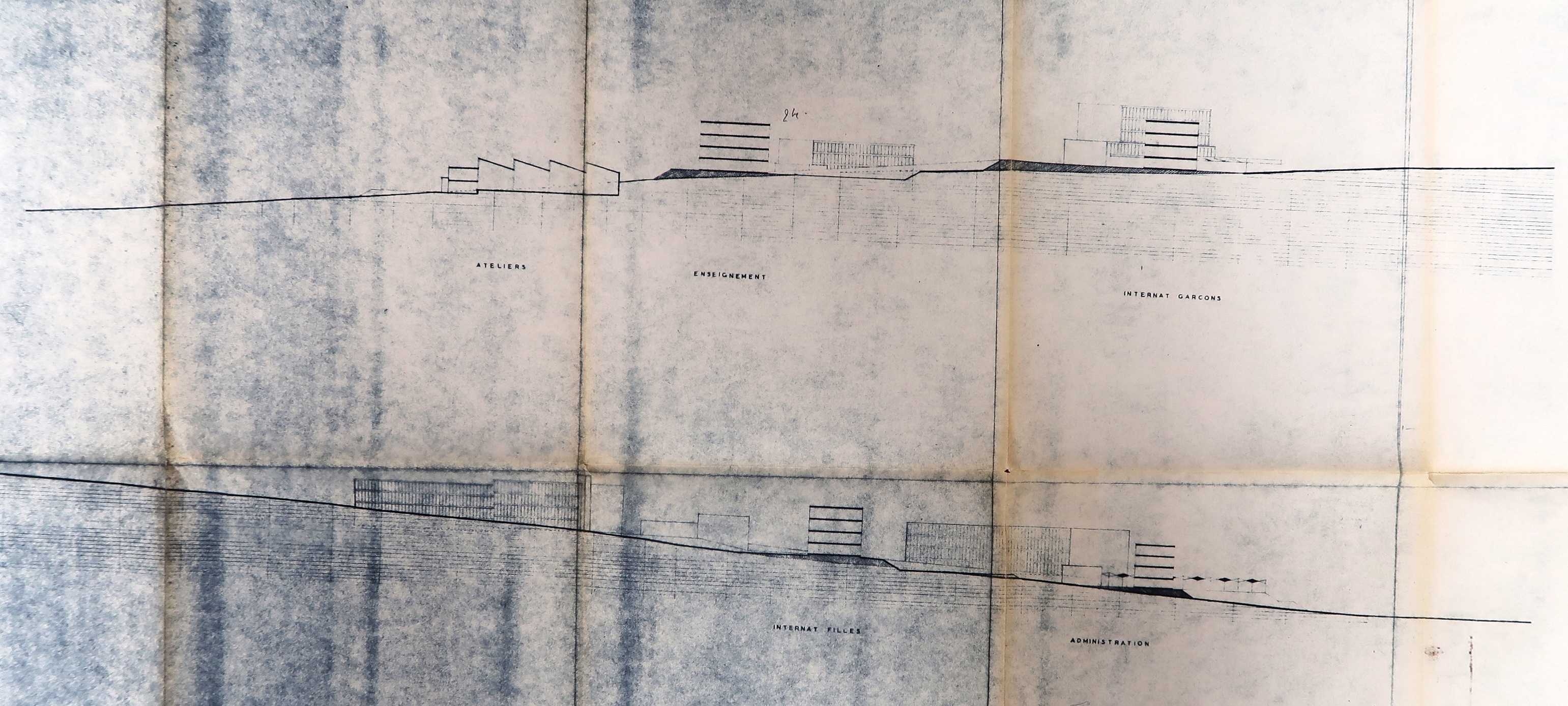 Document figuré issu d'un fonds non classé sur la construction du lycée, conservé dans les archives de l'établissement, comprenant des plans, élévations et coupes dont certains sont datés et signés de l'équipe d'architectes sous la direction de Georges Massé, d'autres, réunis dans un cahier A3, ne le sont pas.