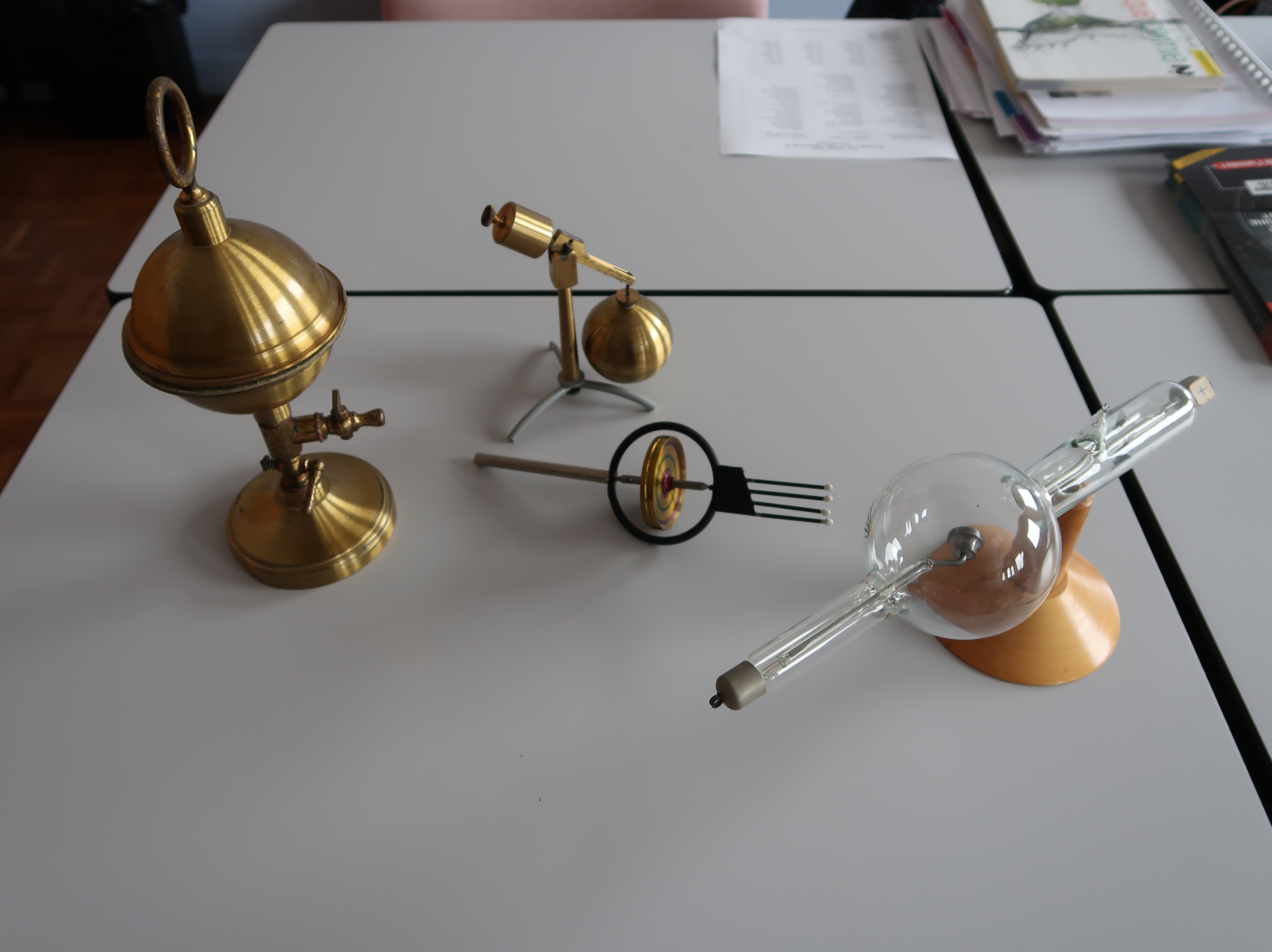 Éléments de la collection d'instruments scientifiques : gyroscope à lames, hémisphères de Magdebourg, baroscope et tube bianodique à rayons XImmatriculation