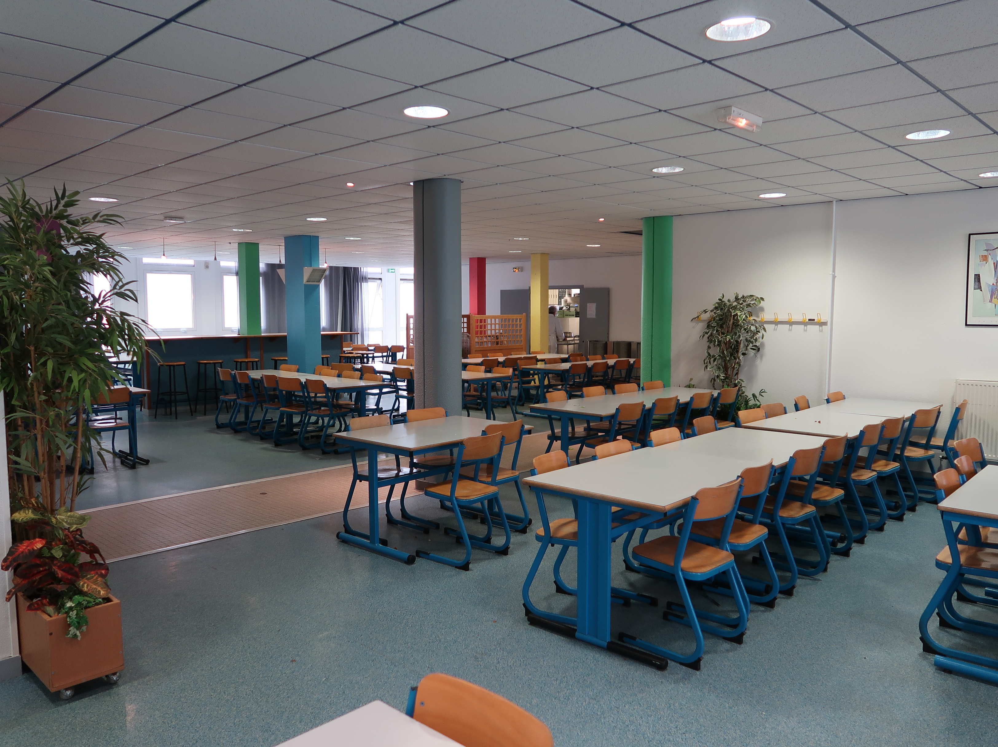 Vue intérieure du réfectoire, réhabilité. Les cloisonnements ont disparu mais, évidemment, pas les poteaux en béton armé de la strcuture.Immatriculation