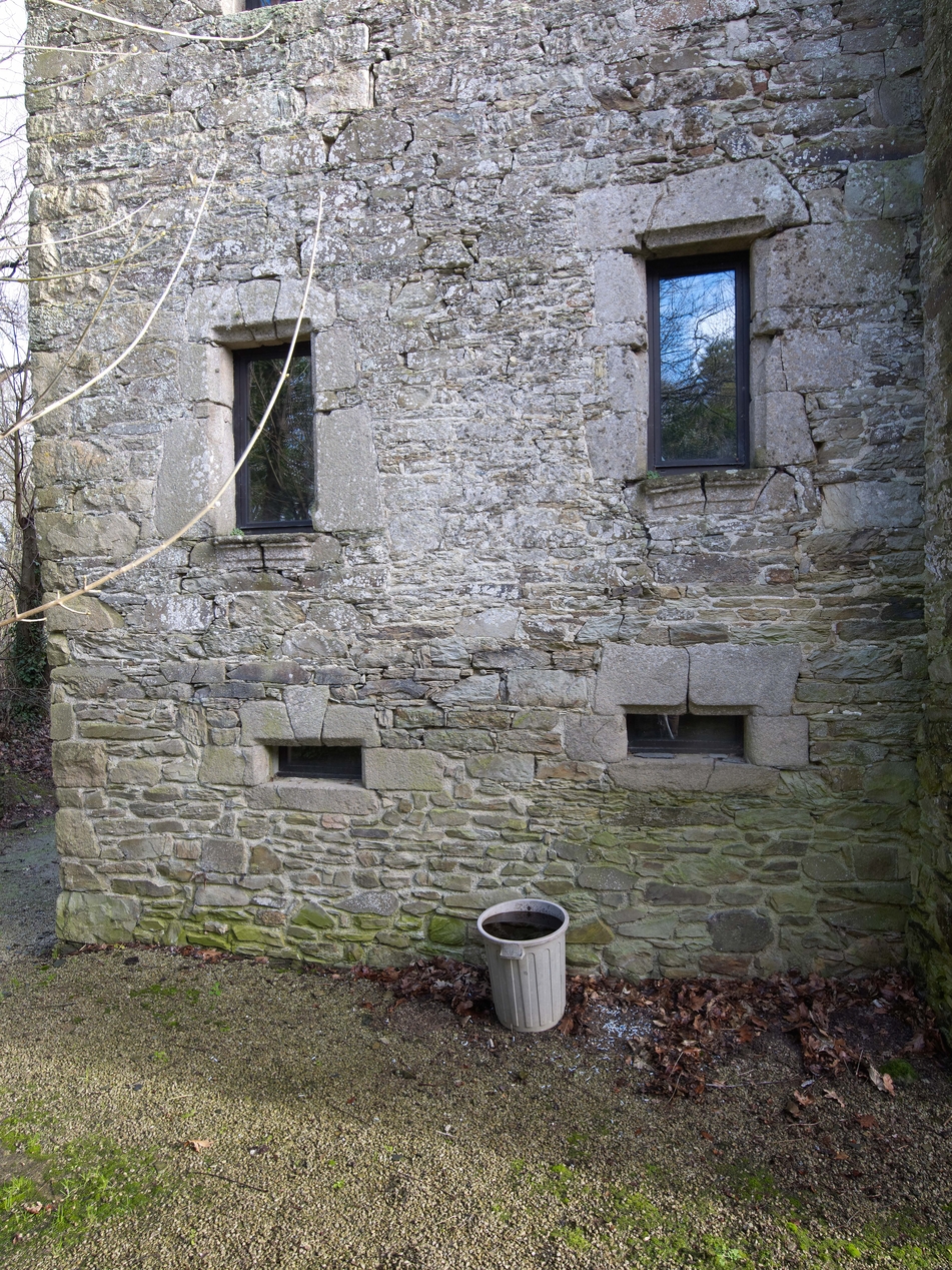 Minihy-Tréguier : manoir de Saint-Renaud, détail du pignon ouest au niveau du rez-de-chaussée. Les deux étroites baies correspondent au cellier situé sous l'escalierImmatriculation