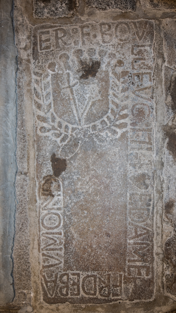 Pierre tombale du choeur : (anciennement placée dans le cimetière) E(cuy)er F.BOULLEUC : 1714. E : DAME FR DE B(E)AUMONDImmatriculation