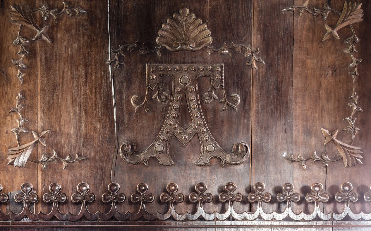 Hall, détail de la cheminée , intiales de Georges AldebertImmatriculation