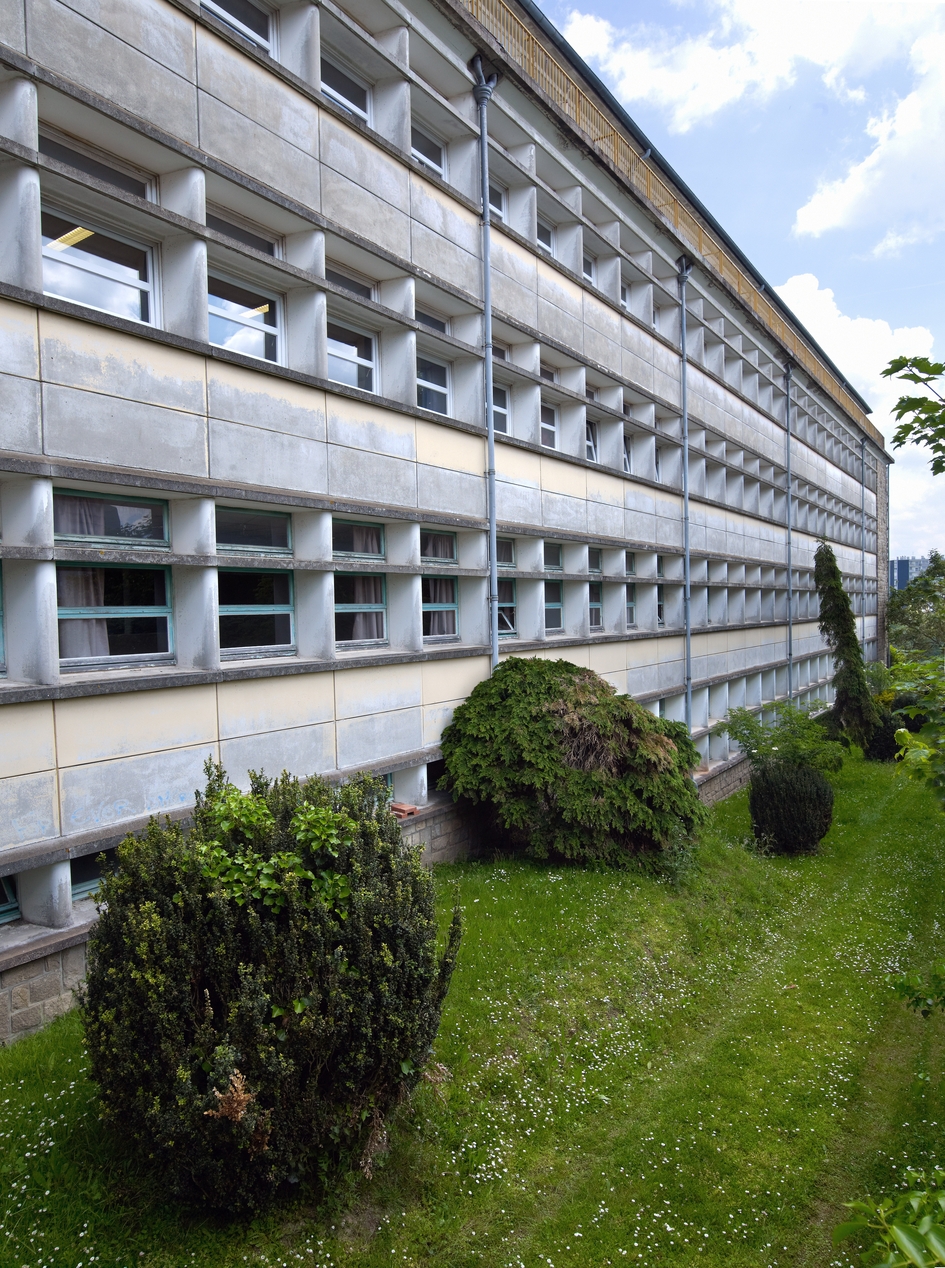 Bâtiment D, internat de 1961 (L. Arretche, Jean et Yann Fauny, architectes), également externat aujourd'hui : façade sud. Le bandeau horizontal, rappelant les fenêtres à meneaux, casse la verticalité de la trame.Immatriculation