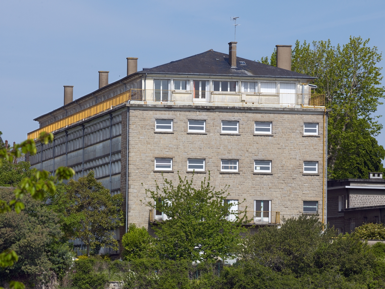 Bâtiment D, internat de 1961 (L. Arretche, Jean et Yann Fauny, architectes), également externat aujourd'hui : pignon sud-est. Vue prise de la rive opposée de la vallée du Gouédic.Immatriculation