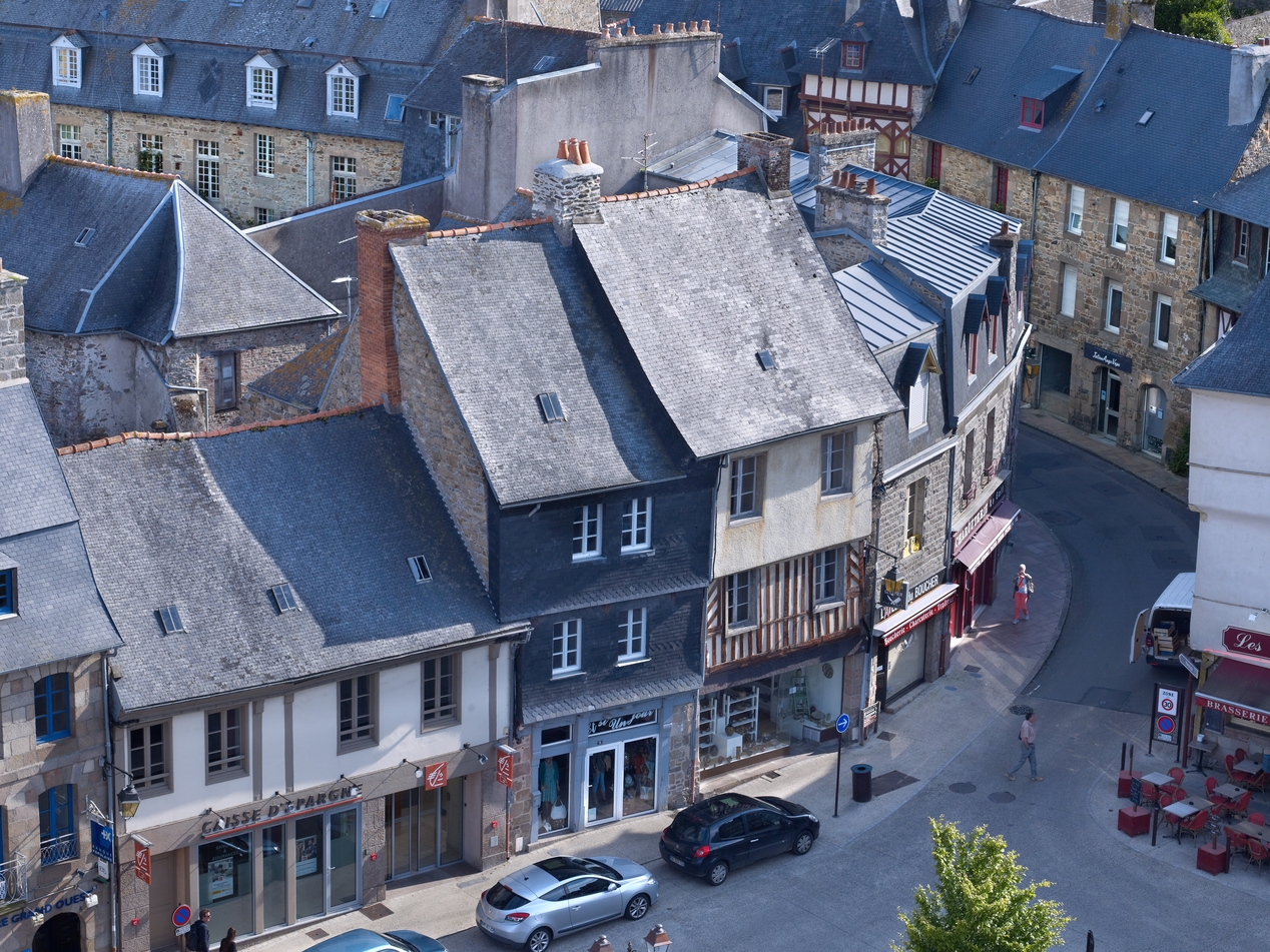 Sud-ouest de la place du Martray depuis la tour des cloches de la cathédrale Saint-Tugdual, alignement de maisons et débouché de la rue de la ChalotaisImmatriculation