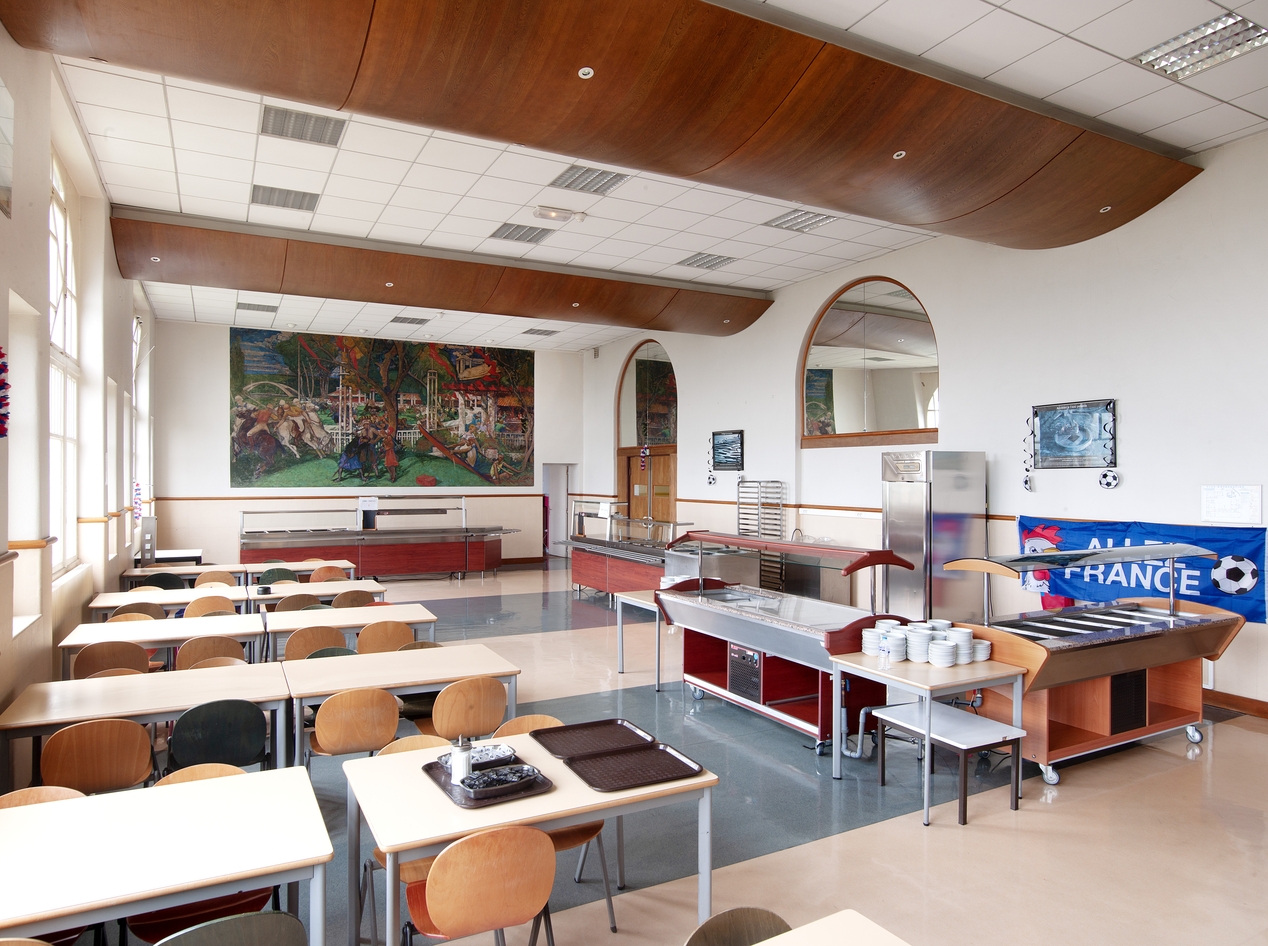 Réfectoire du lycée. A l'arrière plan, la toile marouflée "Les sports, éloge de la vie moderne", d'Henri Marret.Immatriculation