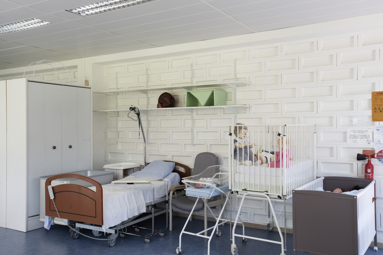 Atelier. Noter la cloison en parpaing de ciment dont la forme joue un rôle acoustique.
