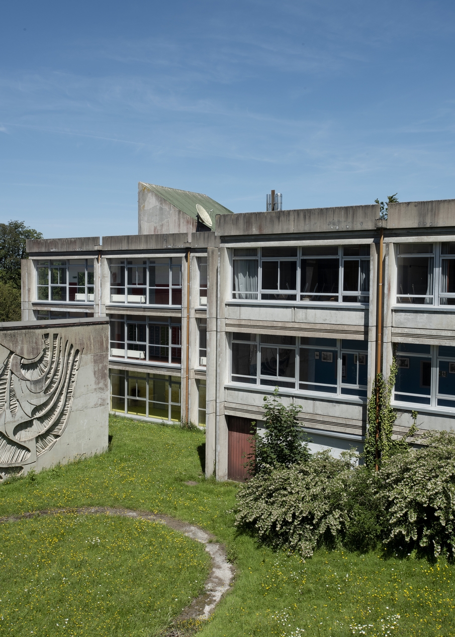 Aile est de l'externat, vue partielle de la façade ouest. A gauche, vue partielle du mur du gymnase.