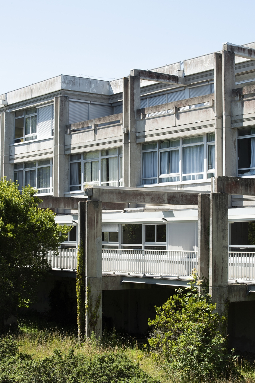 Façade sud de l'internat et son portique. Au niveau de la passerelle, les baies vitrées des réfectoires.Immatriculation
