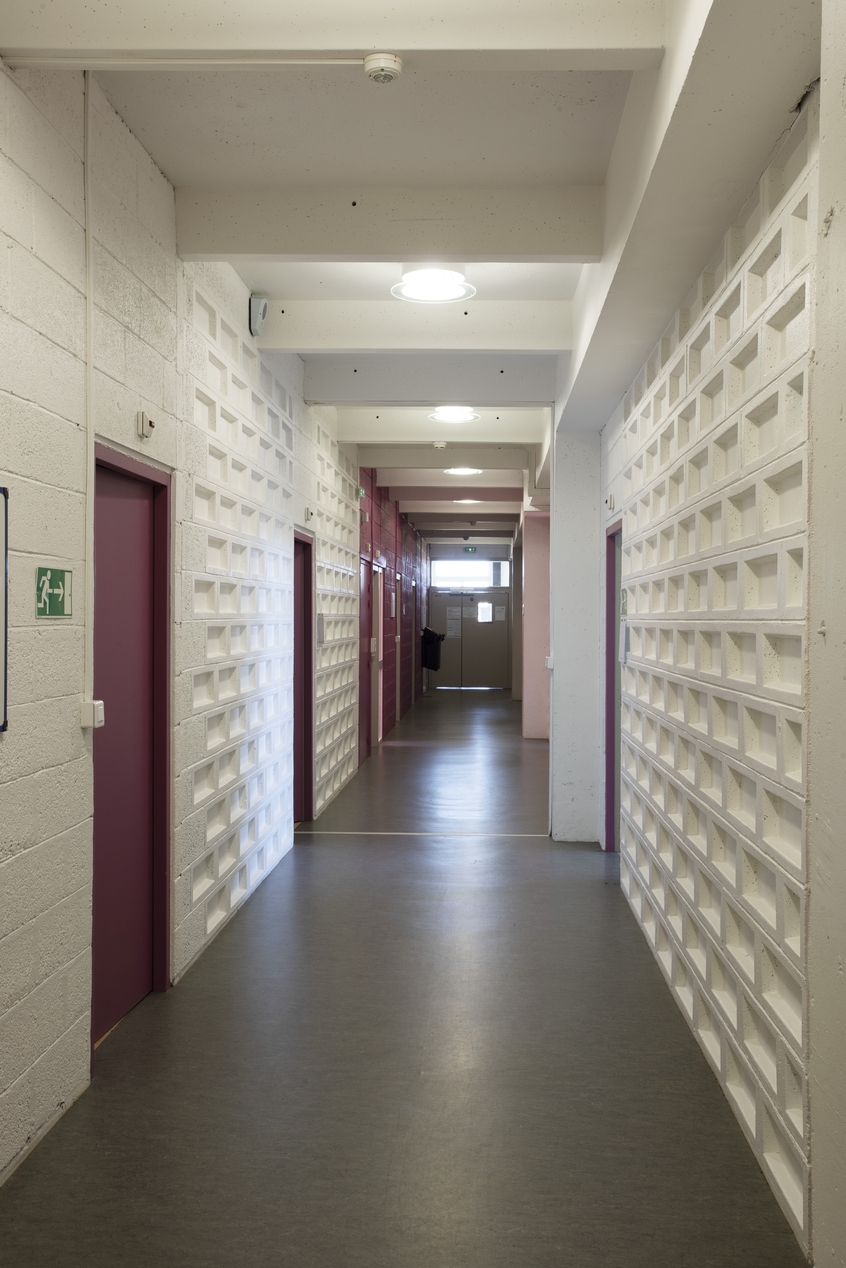Couloir central dans l'internat : béton et ciment.Immatriculation