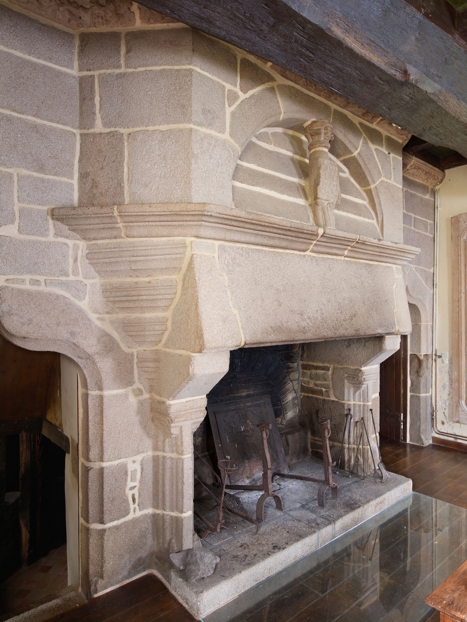 Grande salle basse, mur de refend en pierre de taille de granite, détail de la cheminée (hotte en glacis sous arc mouluré)Immatriculation