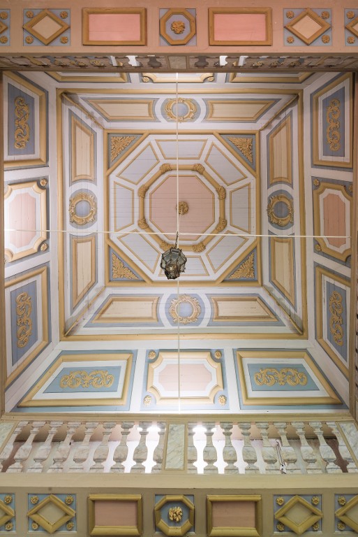 Vue d'ensemble du plafond caréné et mouluré depuis le jour central de l'escalier monumentalImmatriculation
