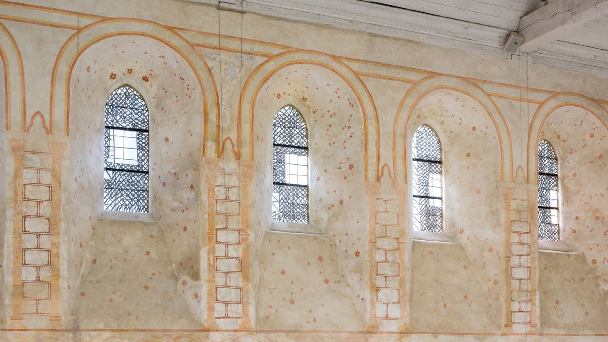 Réfectoire, mur sud, vue d'ensemble du décor peint, vitraux contemporainsImmatriculation