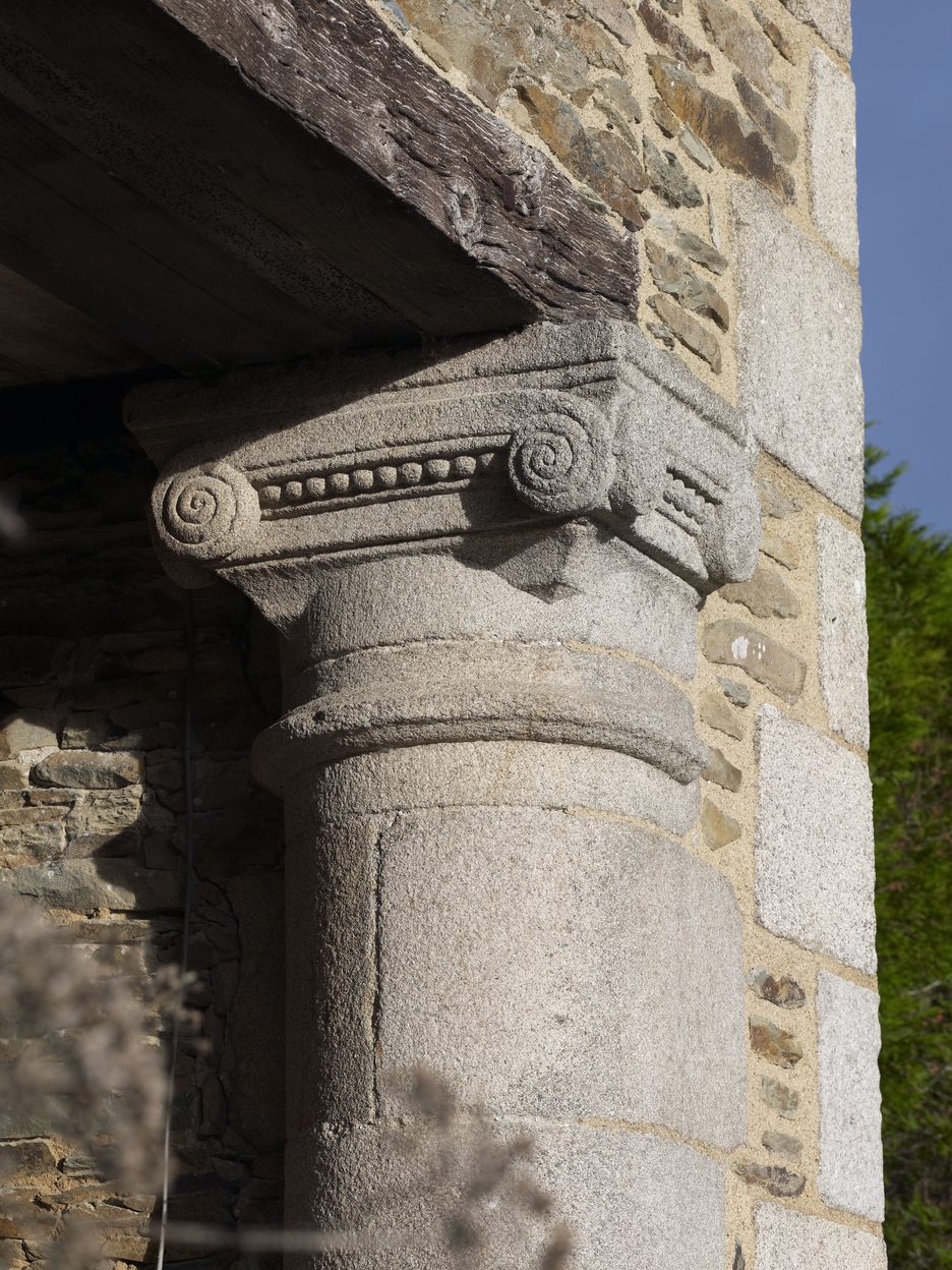 Aile nord en retour d'équerre, élévation est, galerie servant de remise, détail de l'une des colonnes aux chapiteaux sculptés (ordre ionique)Immatriculation