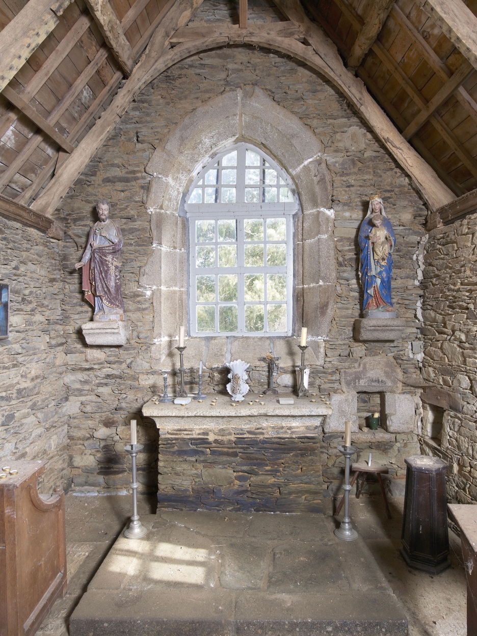 Vue intérieure vers l'est. De part et d'autre de l'autel : deux statues en bois polychrome disposées sur une console. Sous la statue de la Vierge : petite niche-crédence ans l’épaisseur du murImmatriculation
