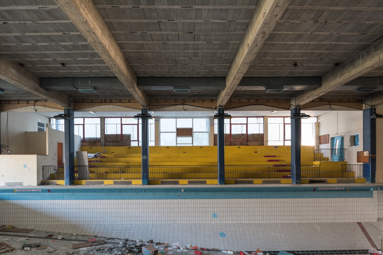 Vue latérale de la piscine prise face aux tribunes. Jean de Jaegher et François Roussseau, architectes, 1968.Immatriculation