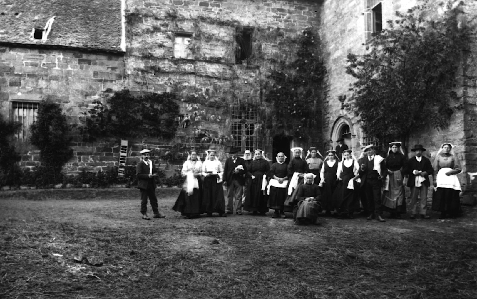 Minihy-Tréguier : manoir de Saint-Renaud, photographie d'un groupe de personnes (femmes portant la coiffe du Trégor). Sur la façade du manoir, treillage pour des arbres fruitiers (poiriers ?) cultivés en espalierImmatriculation