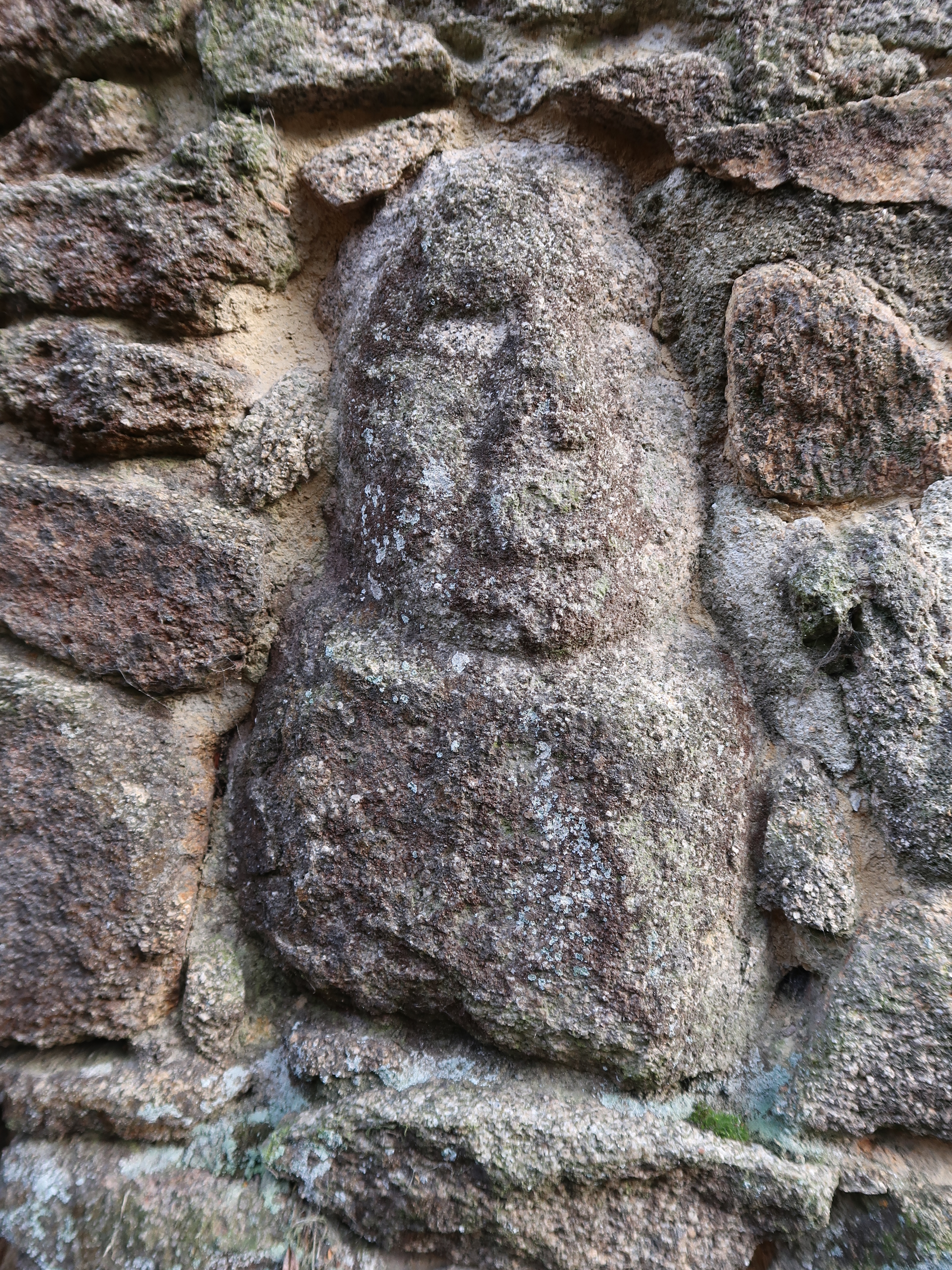 Loguivy-Plougras, le bourg : Moulin à eau de Traou an Dour, élévation ouest, détail d'un remploi intégré à la maçonnerie (tête sculptée dans du granite)Immatriculation