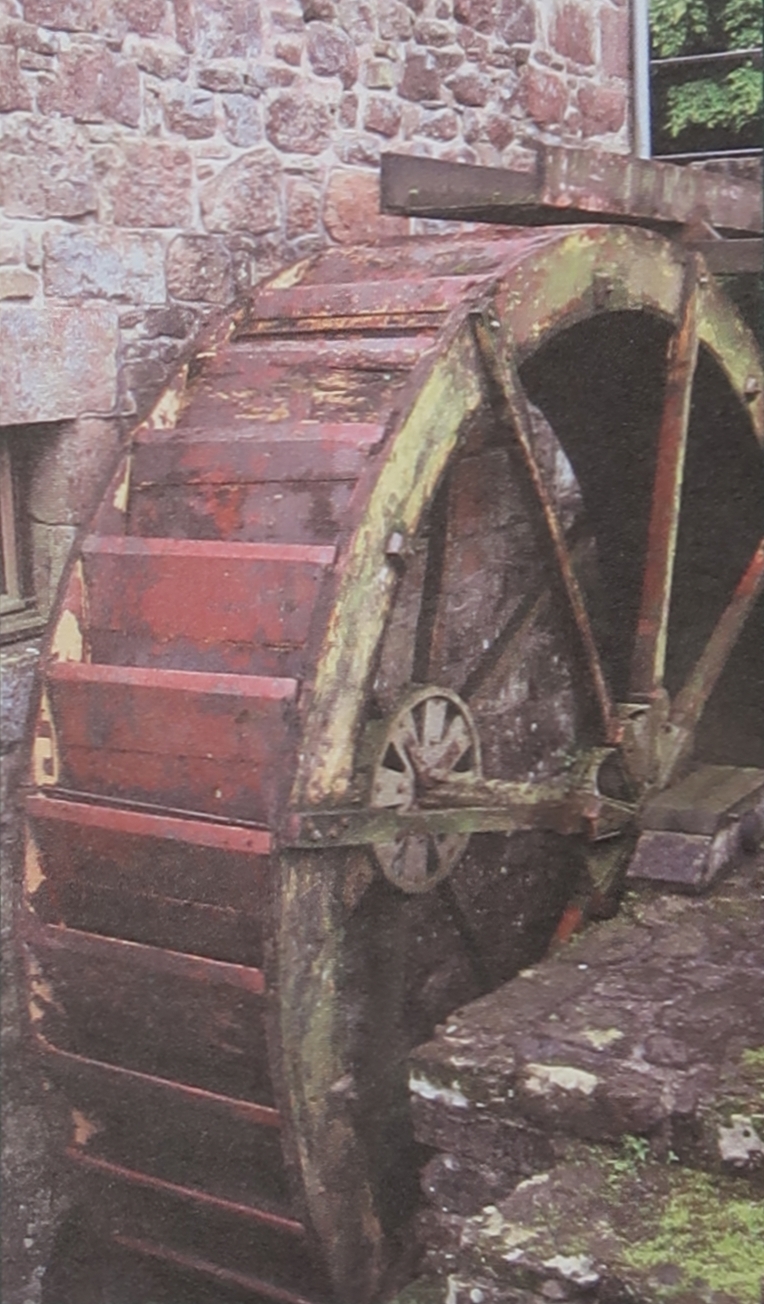 Loguivy-Plougras, le bourg : Moulin à eau de Traou an Dour, détail de la roue à aubes restaurée par Toussait Ollivier (1914-1997), "charron et scieur de long" de métier (atelier des Cinq-Croix à Ploubezre)Immatriculation