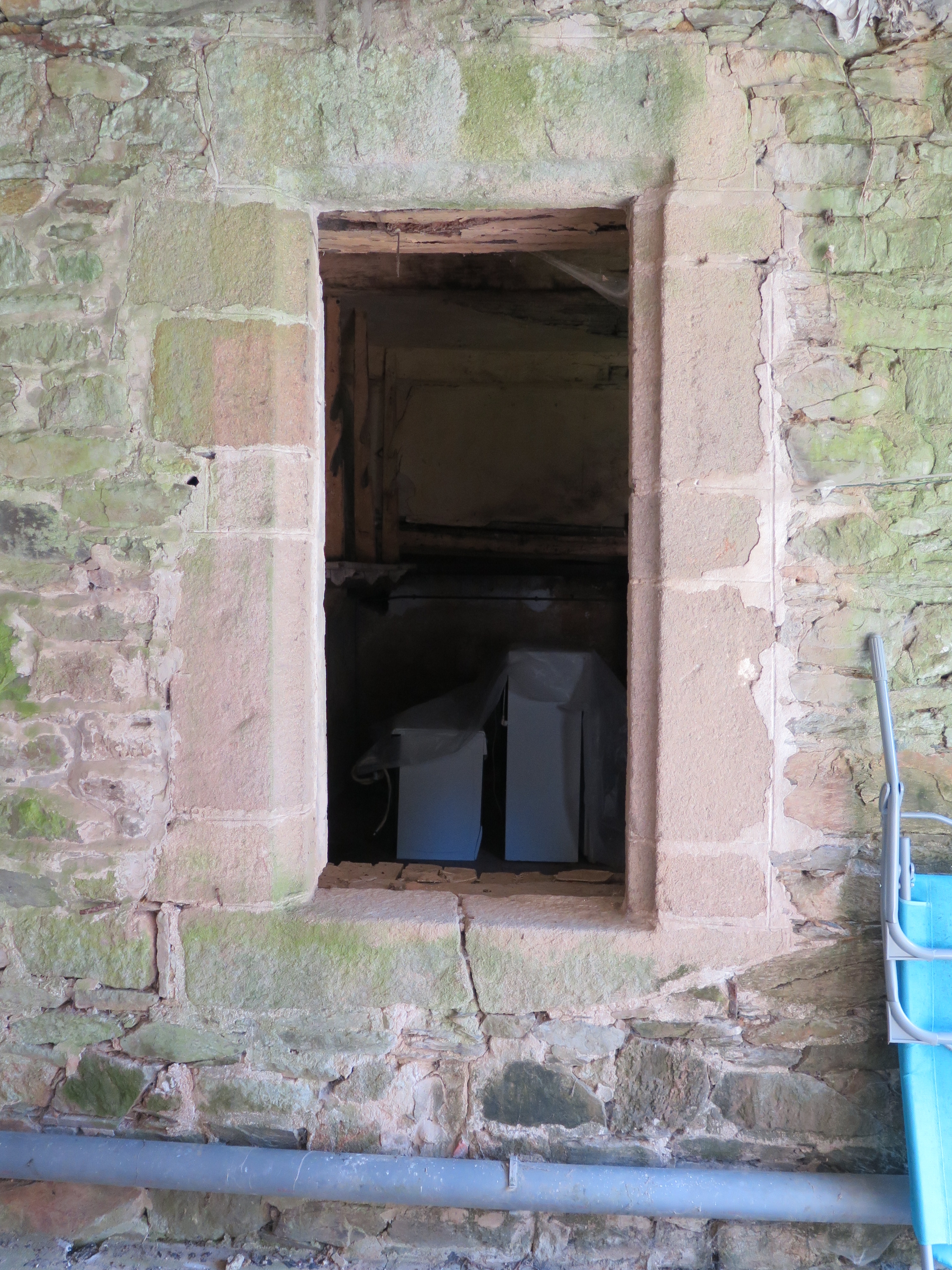 Tréguier, 9 rue des Perdreries (Perderies) : maison dite "Scolasticat", logis principal, élévation ouest (extrémité nord), détail d'une fenêtre à linteau et piédroits moulurés en cavetImmatriculation
