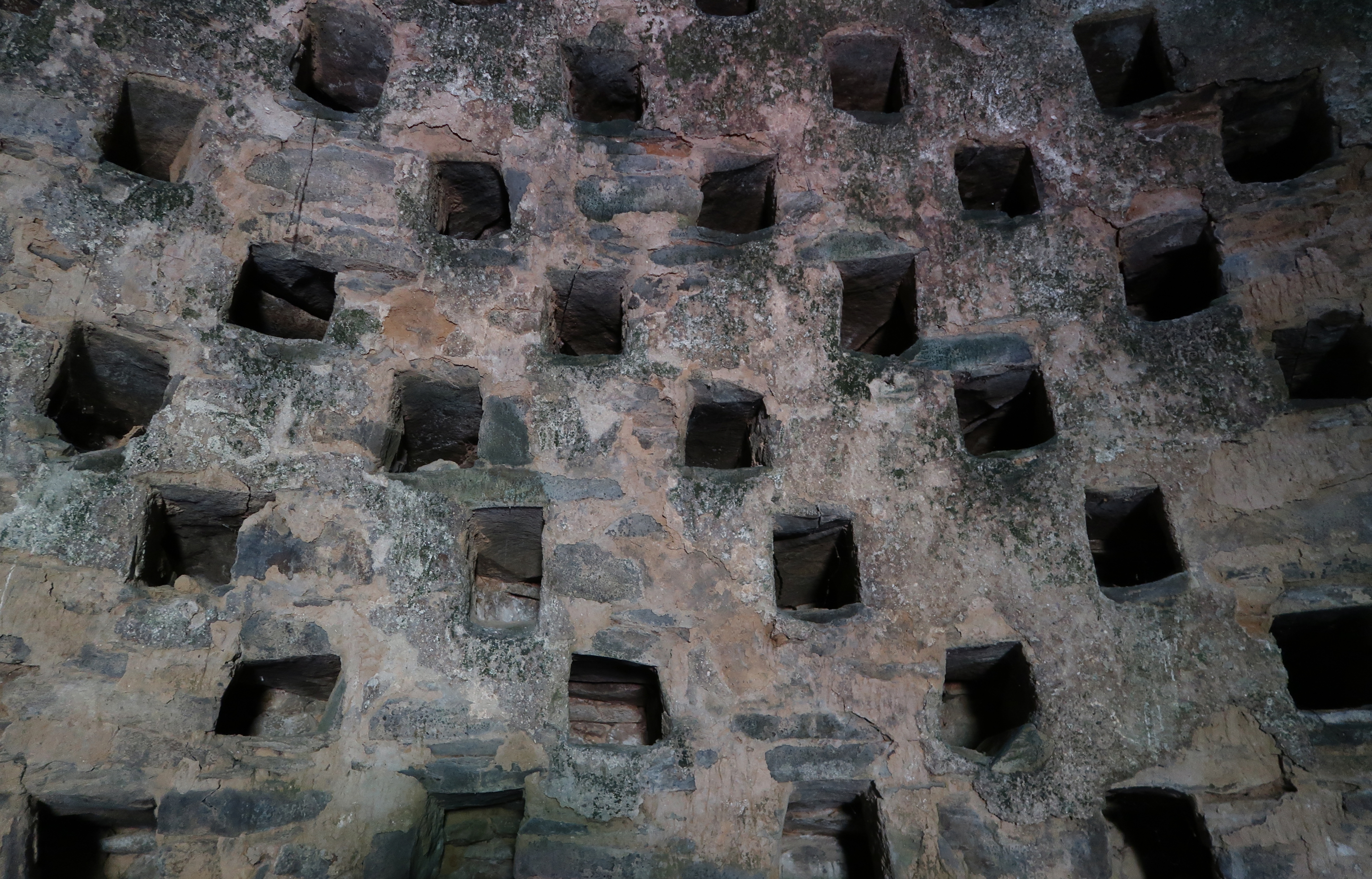 Minihy-Tréguier : colombier de Kermartin, vue de l'intérieur, détail des niches disposés par rangées superposées et disposés en quinconce (par arrangement de cinq unités)Immatriculation