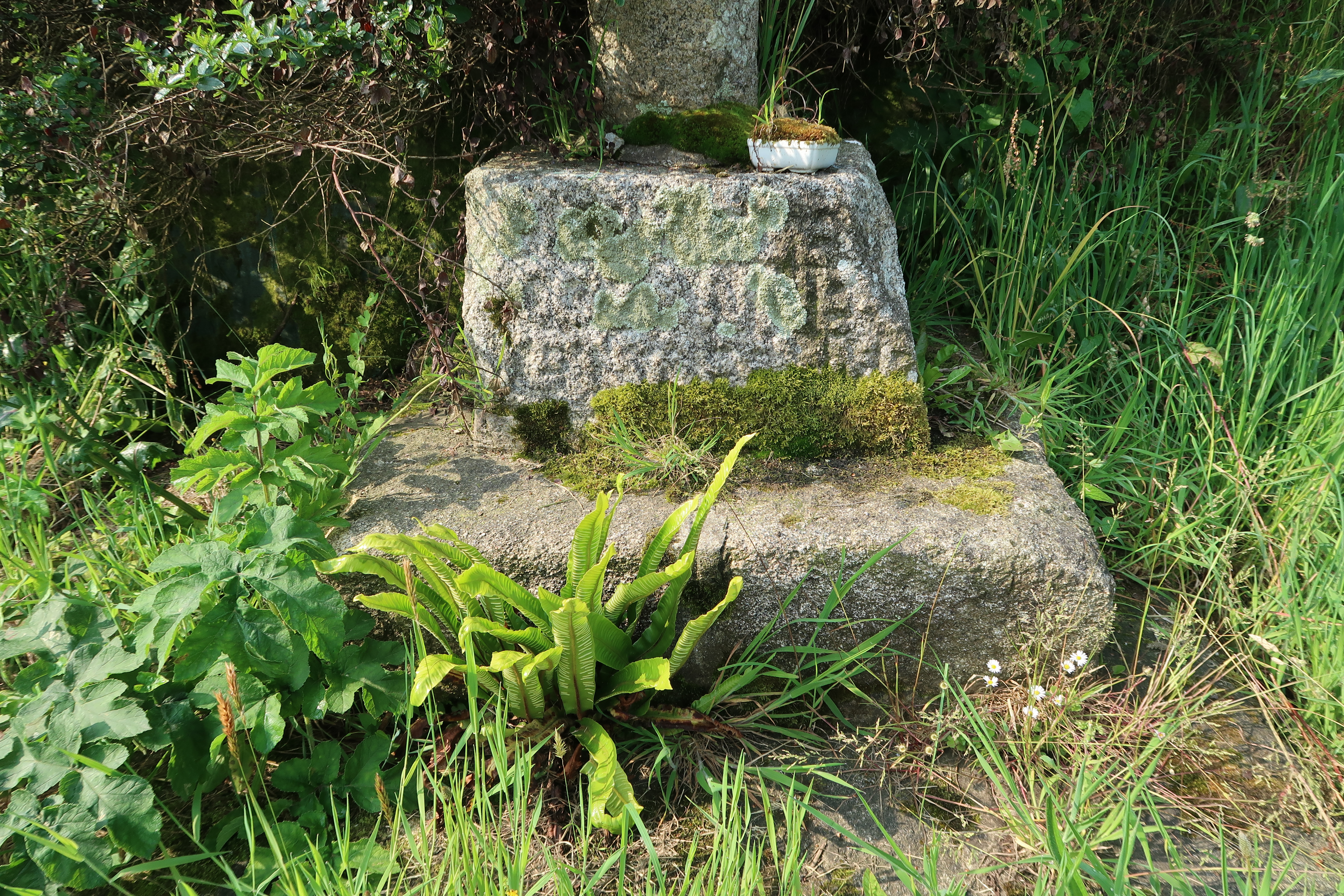 Minihy-Tréguier : croix dite Croix Blanche, détail du socle portant des inscriptionsImmatriculation
