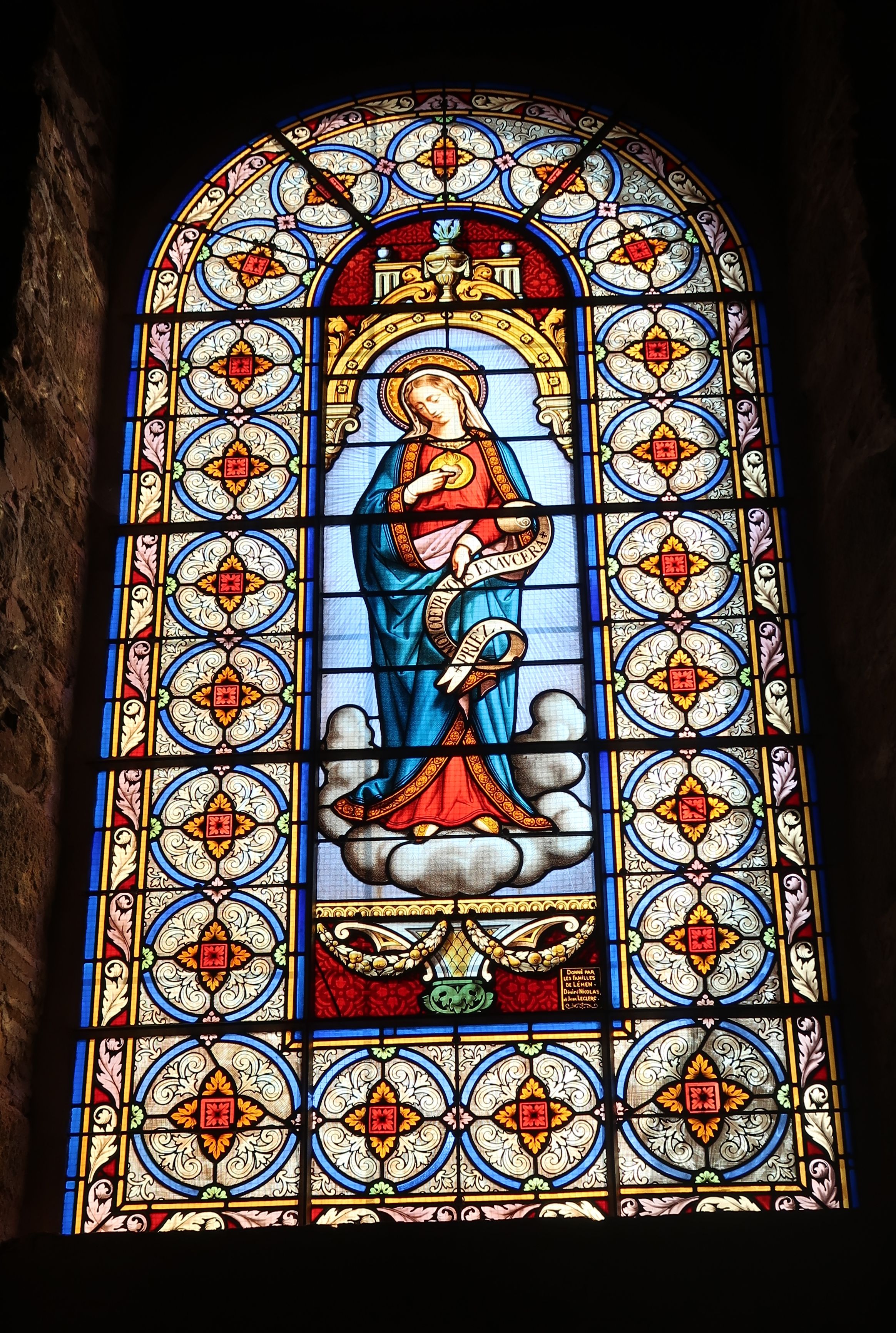 Verrière, mur sud de la nef. Priez mon coeur vous exaucera. Donné par les familles de Léhen, Désiré Nicolas, et Jean LeclercImmatriculation