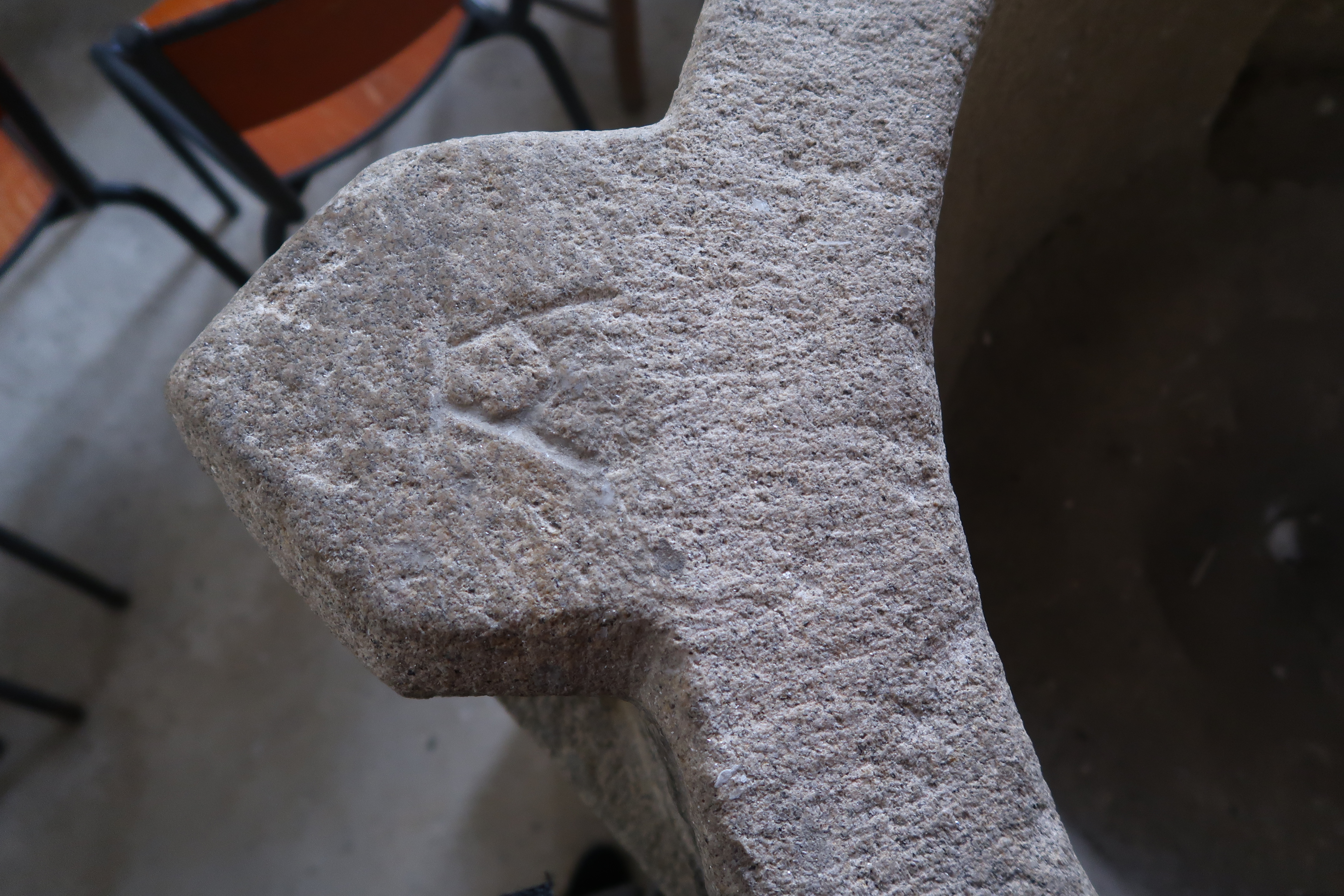 Fonts baptismaux, initiales gravées sur la cuve (Alpha)Immatriculation