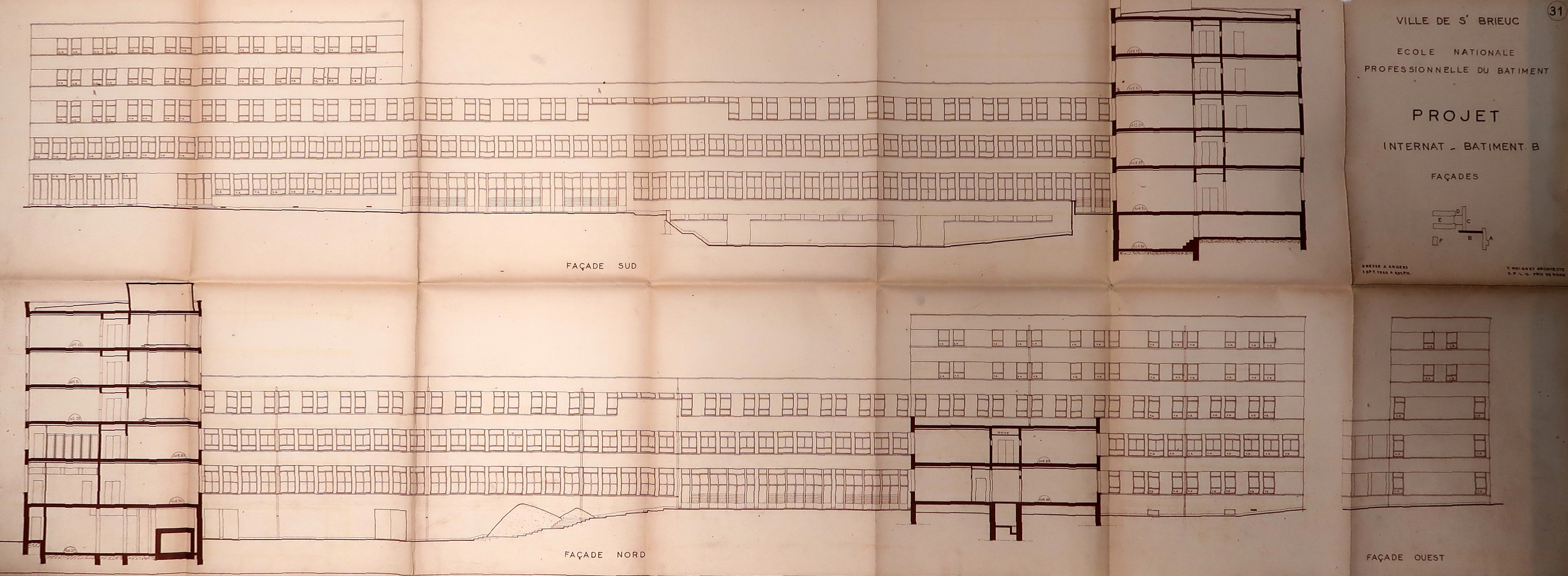 AD 49 : 211J456. Dossier de plans. Projet. École Nationale Professionnelle du Bâtiment. Yves Moignet, 1960.
