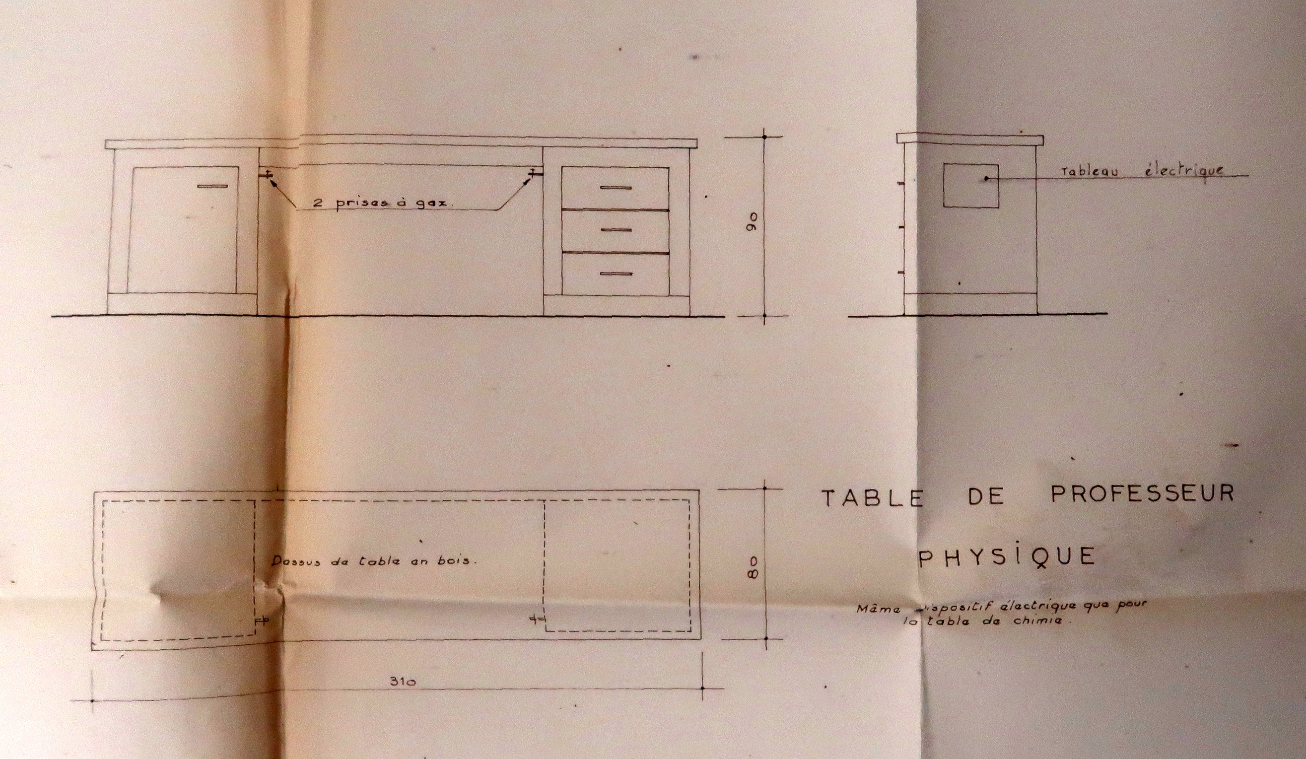 Externat- Bâtiment C. Rez-de-chaussée. Classes de chimie et de physique : détail sur une table de professeur de physique. Yves Moignet, architecte, 1960.Immatriculation