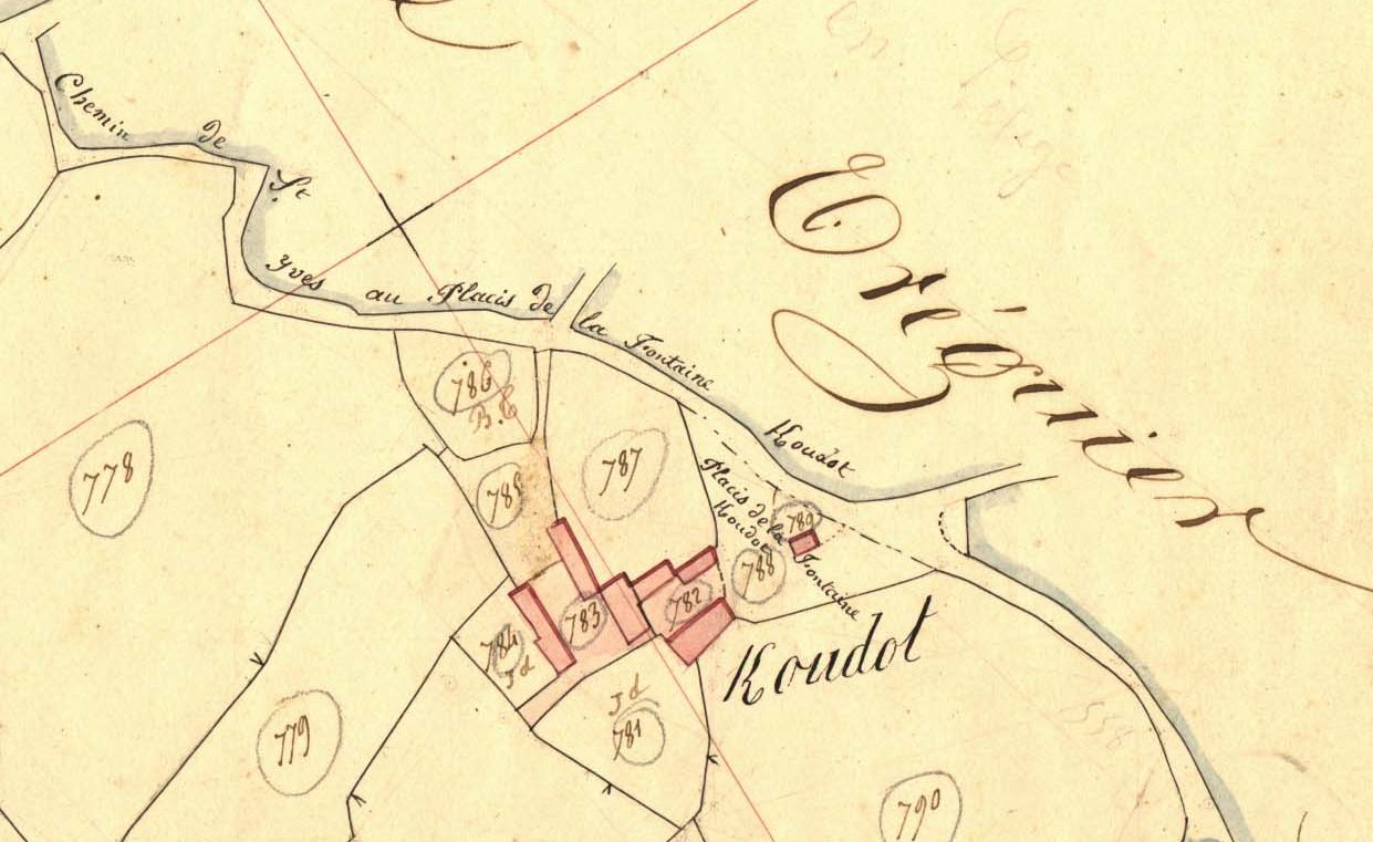 La fontaine Keroudot en 1834. Extrait du cadastre ancien de Minihy-Tréguier, section A3 (A.D. 22, série 3 P)Immatriculation