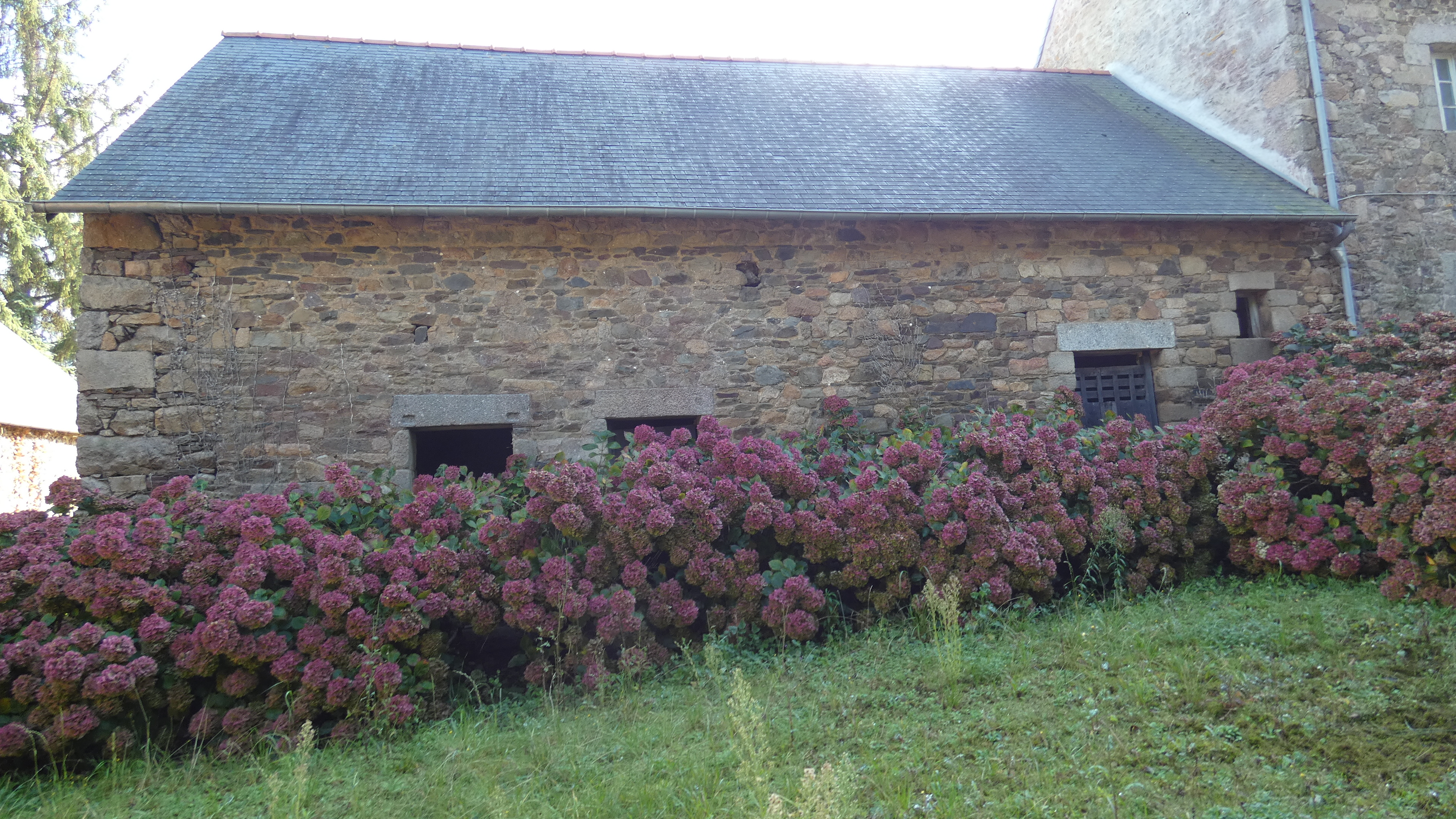 Vue nord-est de la façade nord-ouest de la soue à cochons/étable. Etat en 2019.Immatriculation