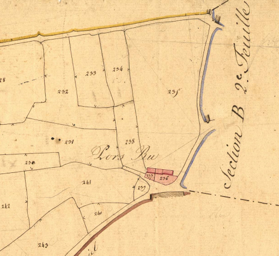 Extrait du cadastre ancien de 1829, section D feuille 1. Maisons, 2 Porz Ru.Immatriculation