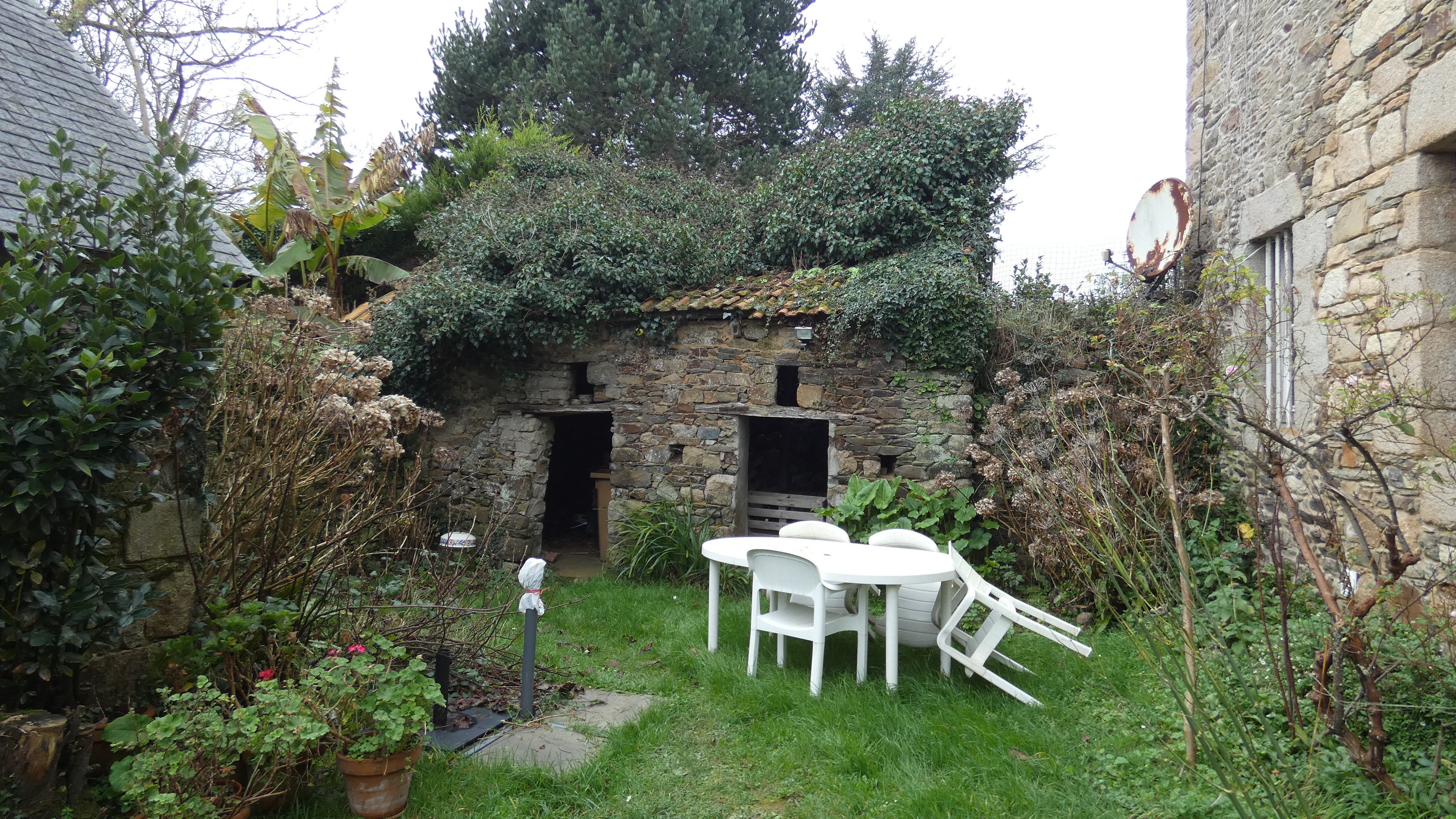 Vue générale, depuis l'est, des dépendances sud-ouest (étables et/ou soues à cochons). Etat en 2019.Immatriculation