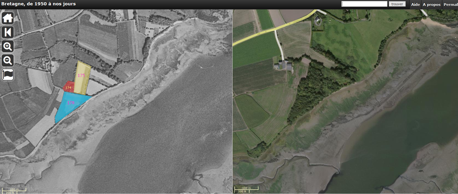 Parcelles 174, 175 et 178, en bord de Trieux, concernées par la présence de vestiges gallo-romain. Vue en 1950 et de nos jours.Immatriculation