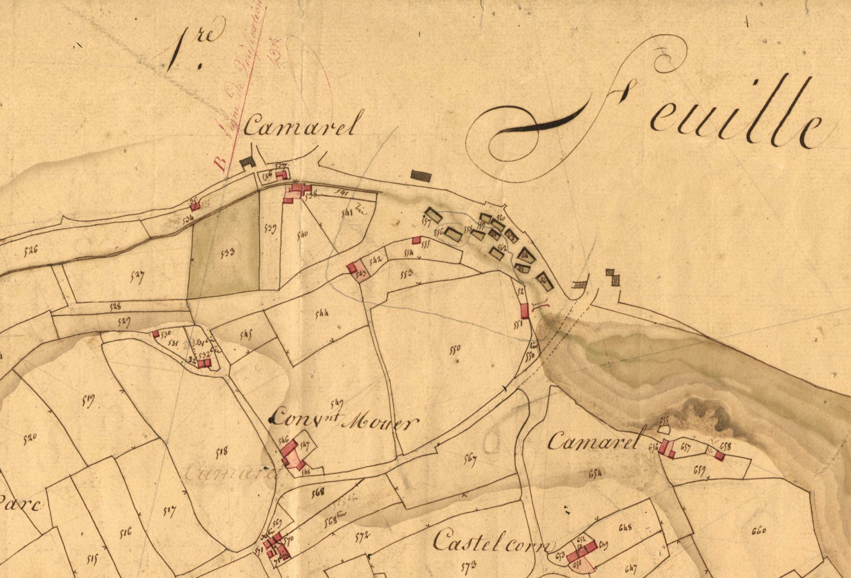 Extrait du cadastre ancien de 1829, section B feuille 2. Chapelet de 11 routoirs à Camarel.Immatriculation
