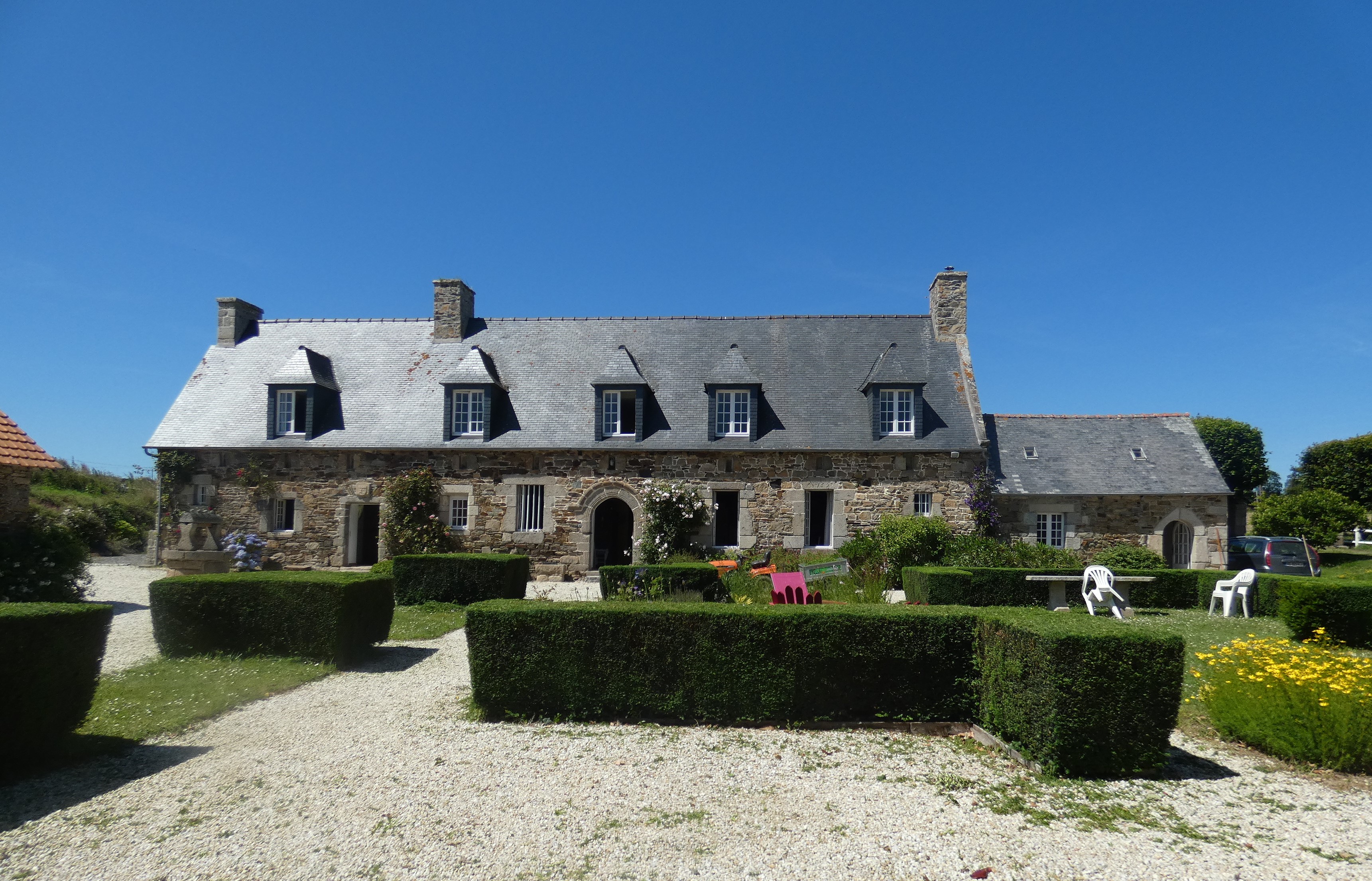 Ancien manoir de Kergrist. Vue générale de la façade sud-ouest du logis. Etat en 2019.Immatriculation