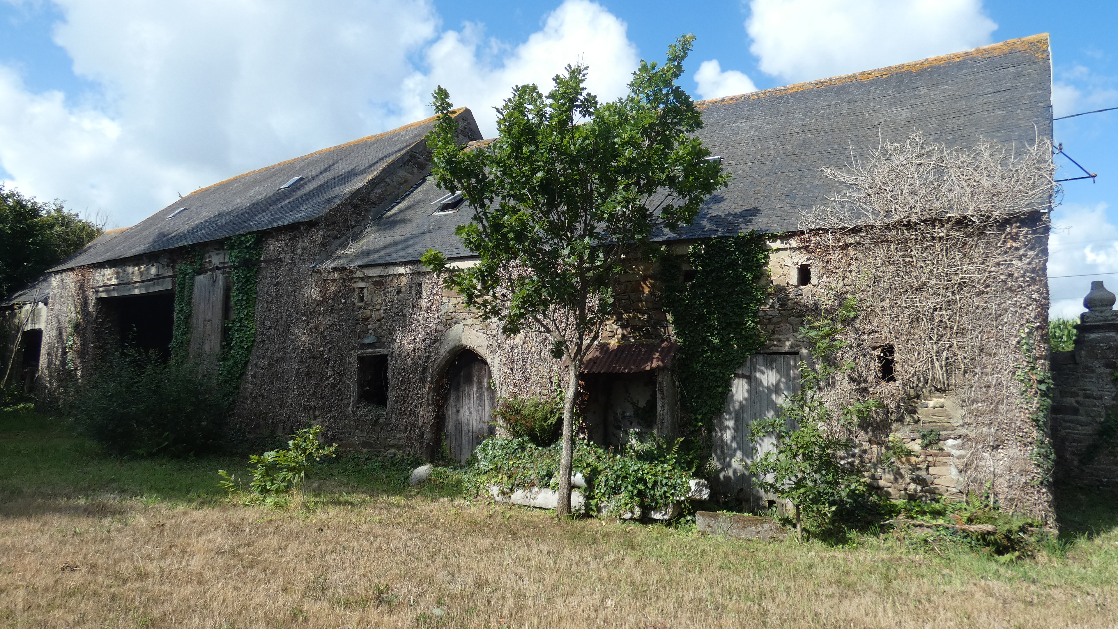 Ferme de Kerescantou. Façade est d'une dépendance, porte à arc brisé chanfreiné issue du 15e ou du 16e siècles. Etat en 2019.Immatriculation