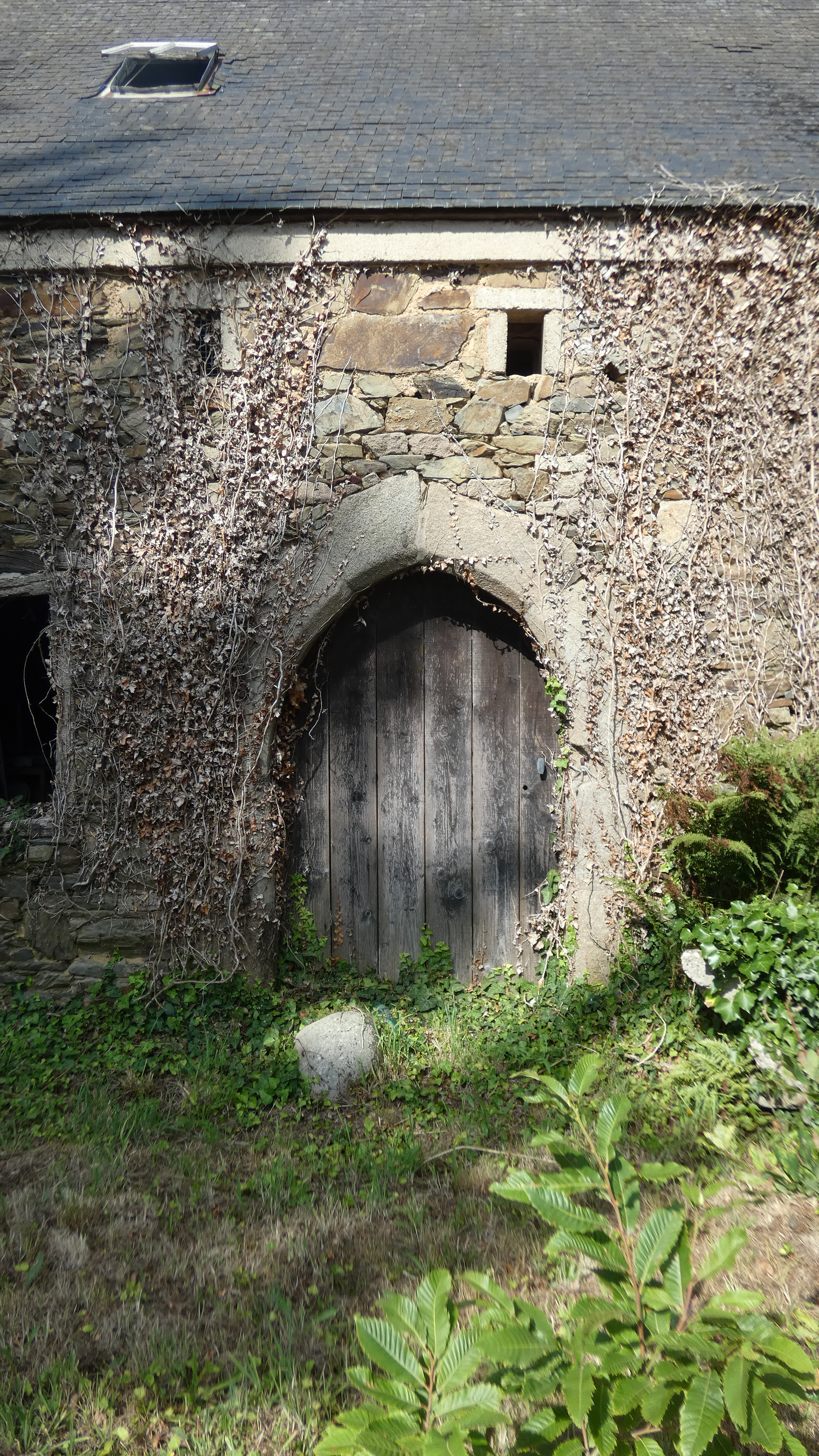 Ferme de Kerescantou. Façade est d'une dépendance, détail de la porte à arc brisé chanfreiné issue du 15e ou du 16e siècles. Etat en 2019.Immatriculation