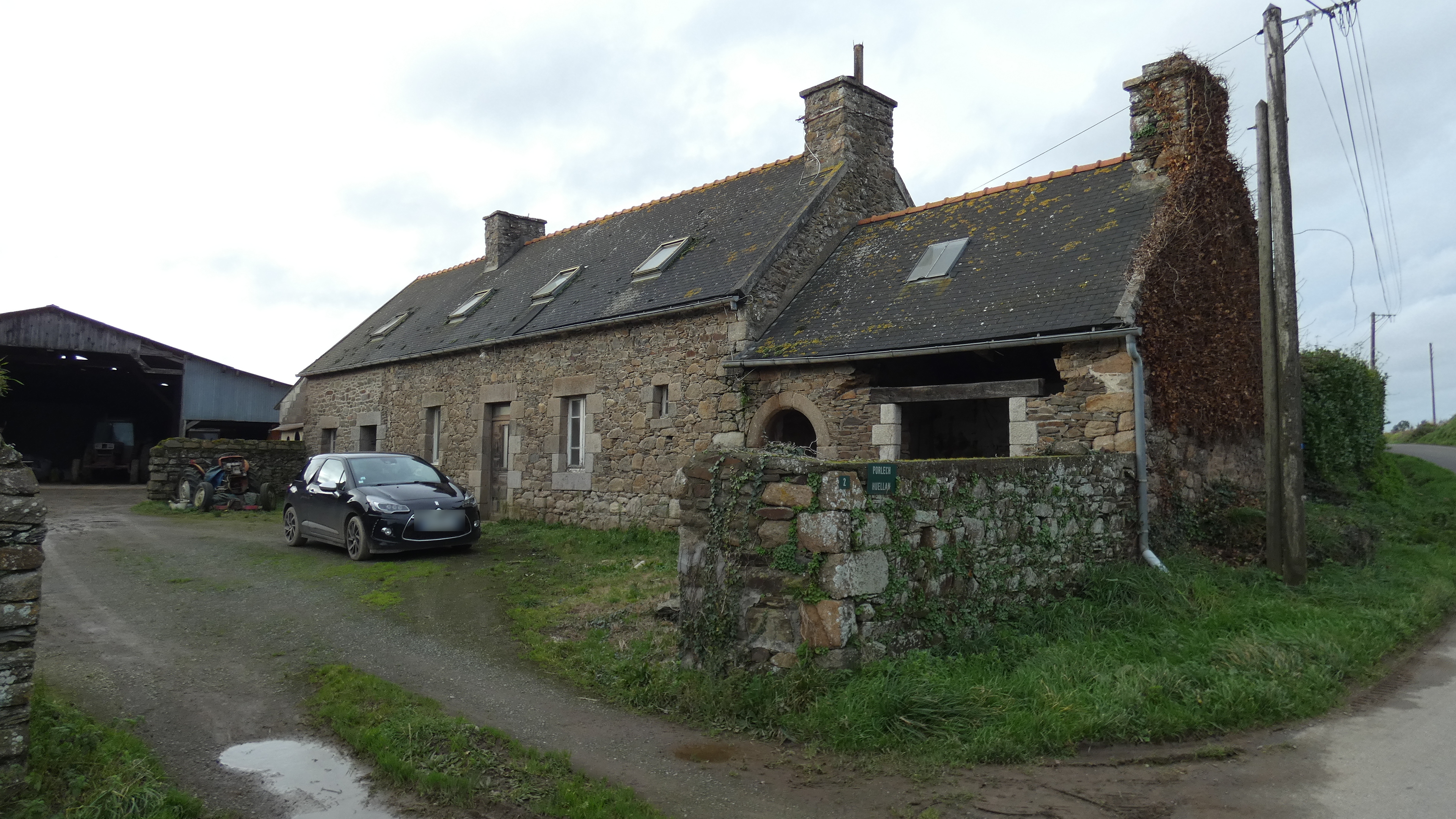 Ferme du 2 Porz Lec'h Huellan. Façade sud-est du logis et de deux dépendances. Etat en 2019.Immatriculation