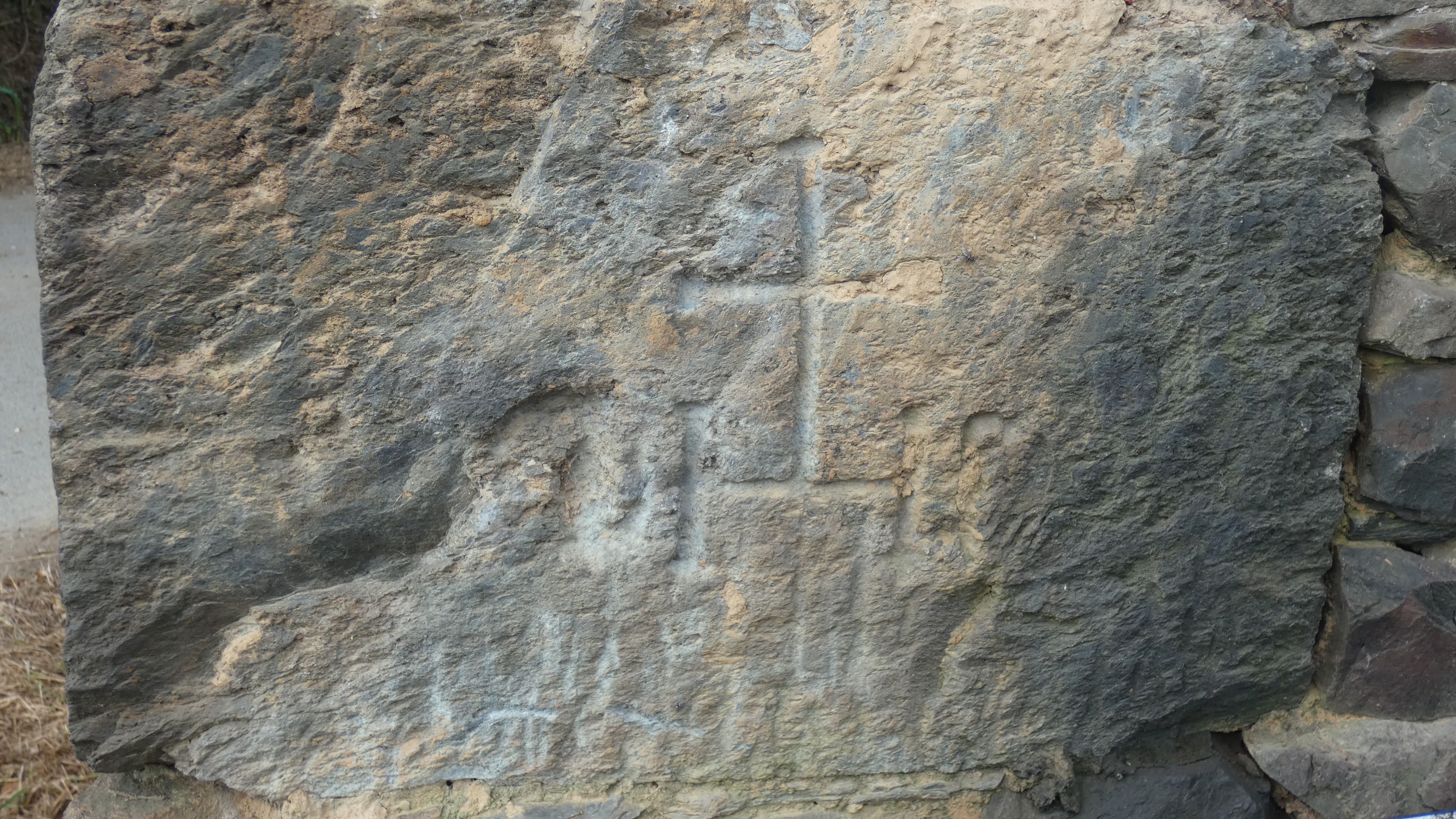 Ferme de Kerjean. Chaînage d'angle de la dépendance ouest, monogramme IHS. Etat en 2019.Immatriculation