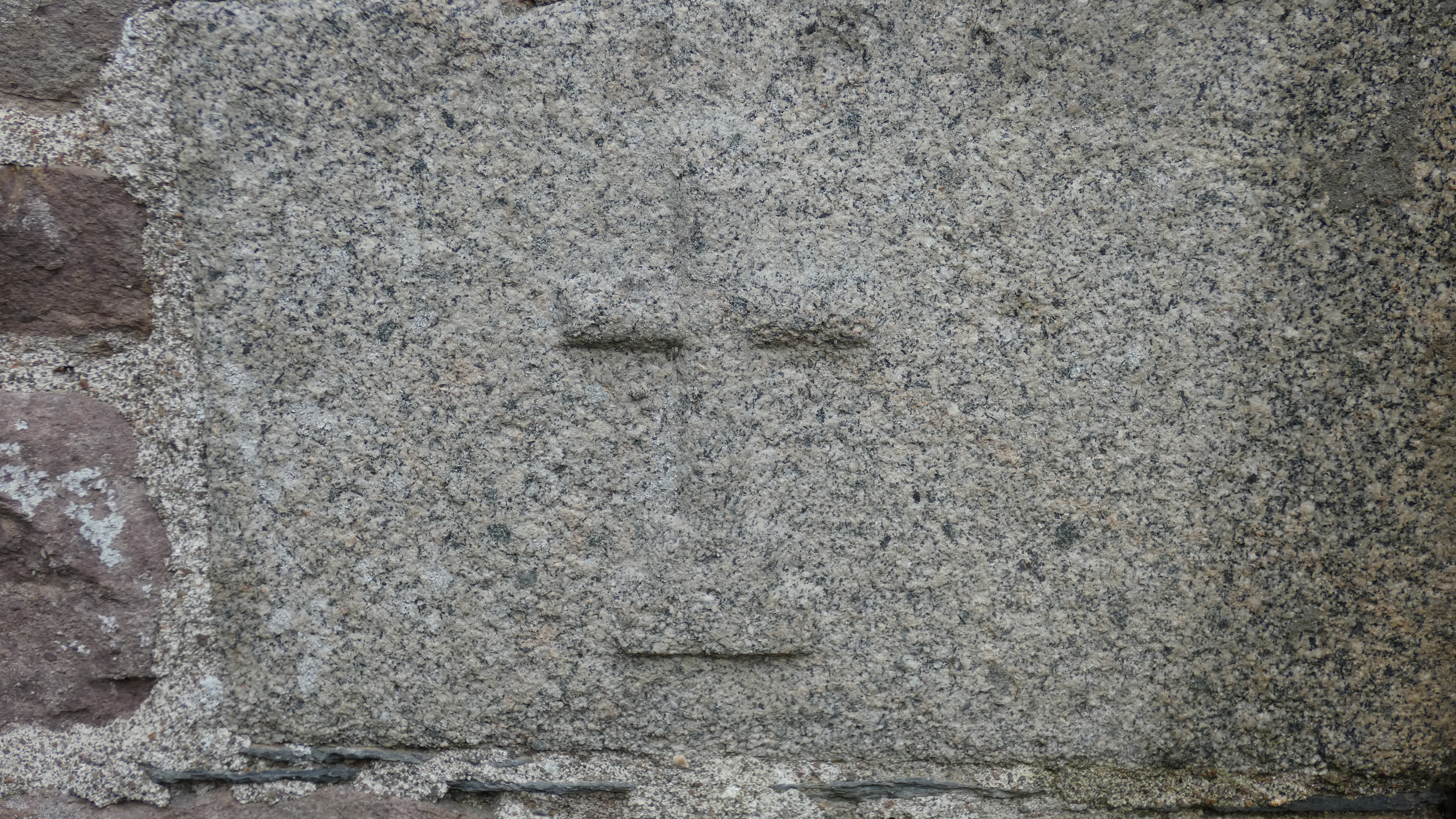 Ferme de Traouas. Détail d'une croix portée sur la façade arrière du logis. Etat en 2019.Immatriculation