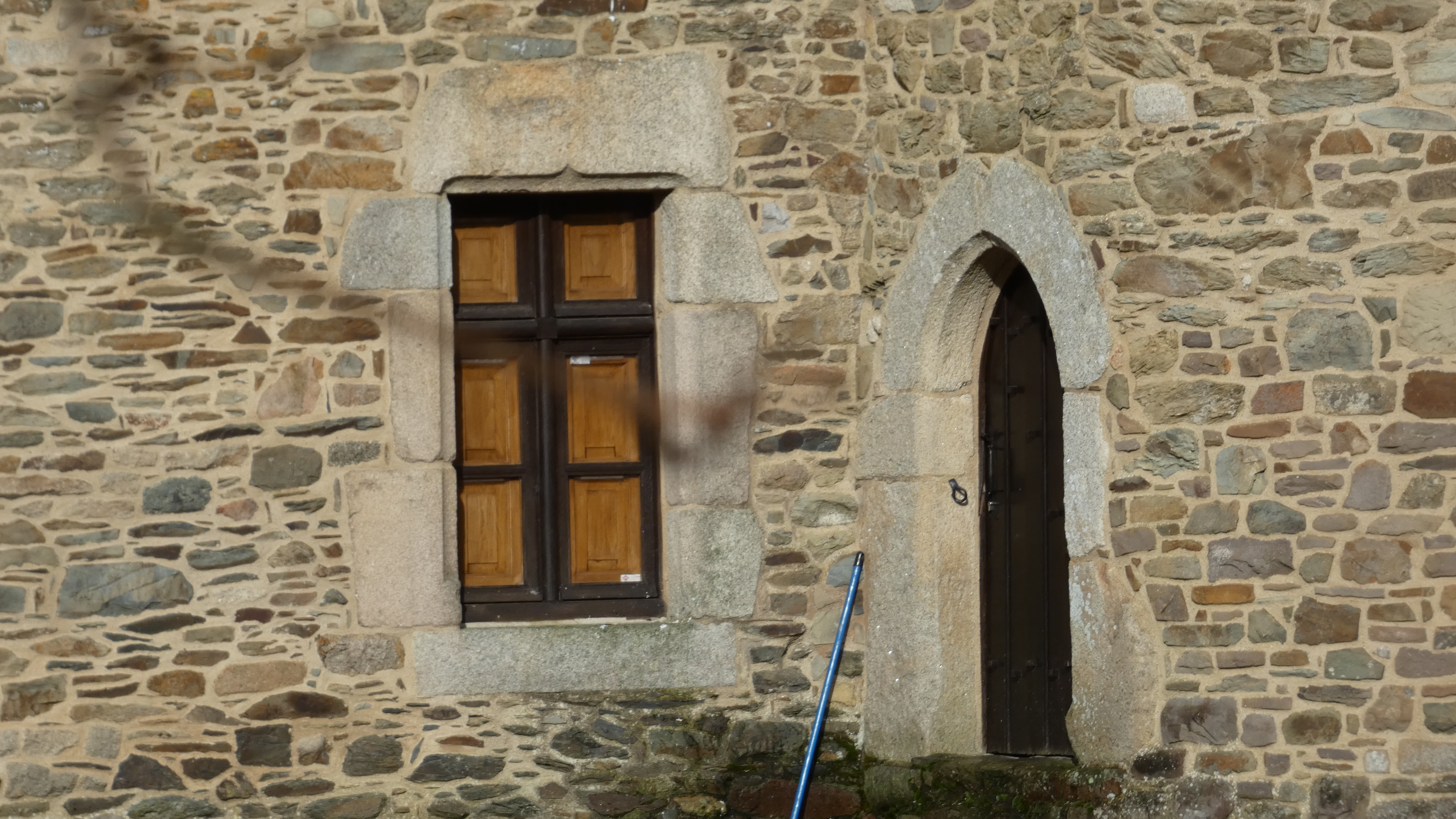 Façade sud-est du manoir. Détail de la porte d'entrée à arc plein cintre de la tour 3/4 hors oeuvre et d'une des fenêtres du rez-de-chaussée ajoutée à la fin du 20e siècle - début du 21e siècle. Etat en 2019.Immatriculation
