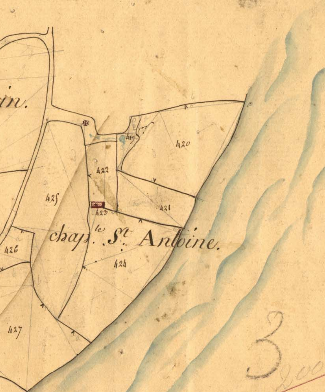 Extrait du cadastre ancien de 1829, section C feuille 2. Chapelle Saint-Antoine accompagnée d'une croix et d'une fontaine.Immatriculation