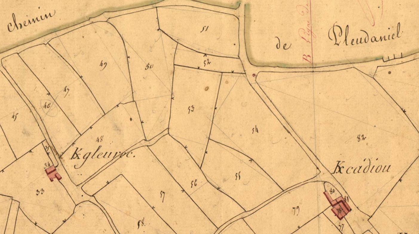 Série 3 P. Fonds du cadastre ancien. Tableau d'assemblage et plans parcellaires de la commune de Pleudaniel, 1829.