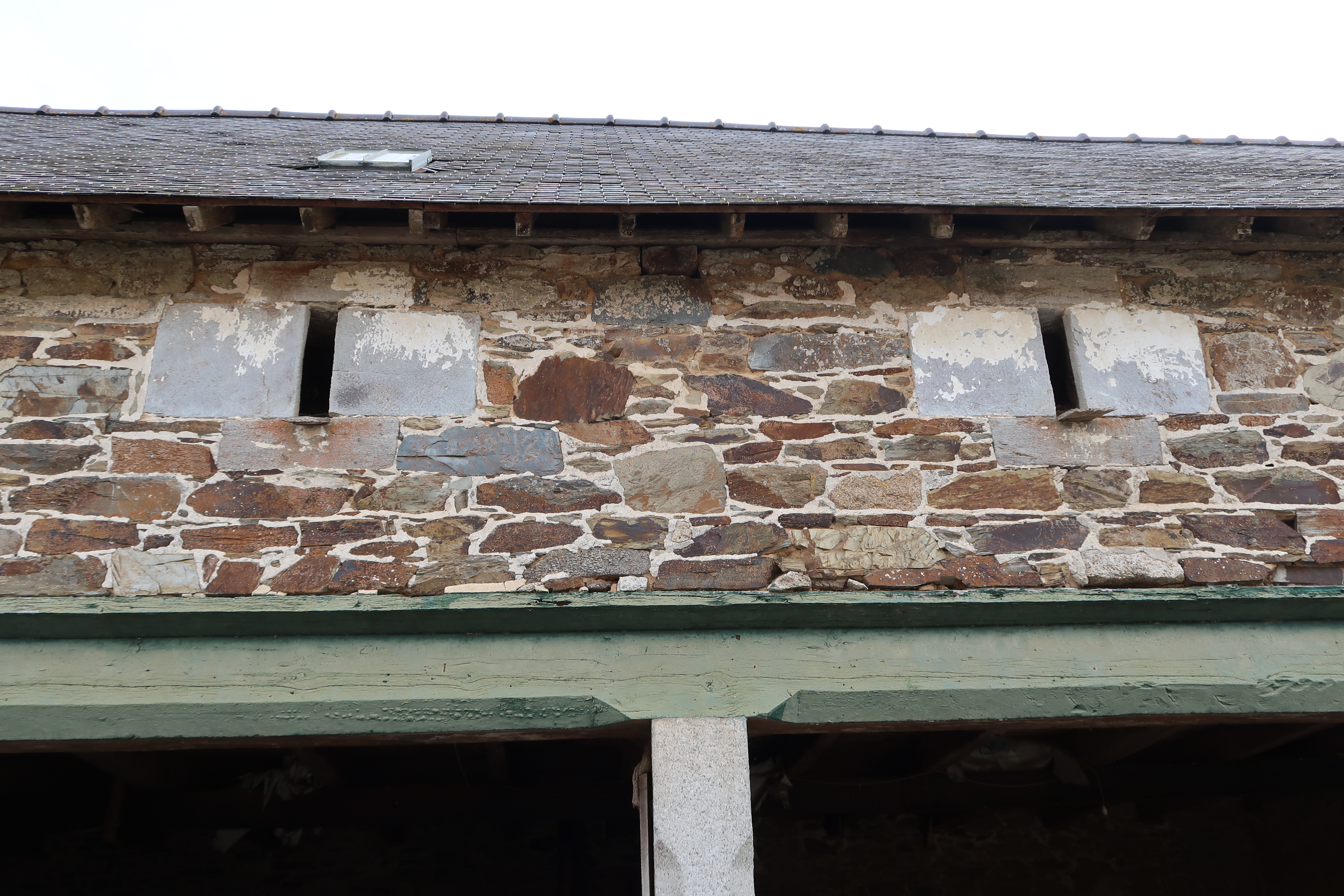 Minihy-Tréguier, Sévéon : grange-remise à trois piliers en granite datée "1839", détail de l'élévation principale orientée vers l'ouest-sud-ouest, jours de ventilation du grenier (transformés en abris à pigeon avec pierre d'envol ?)Immatriculation