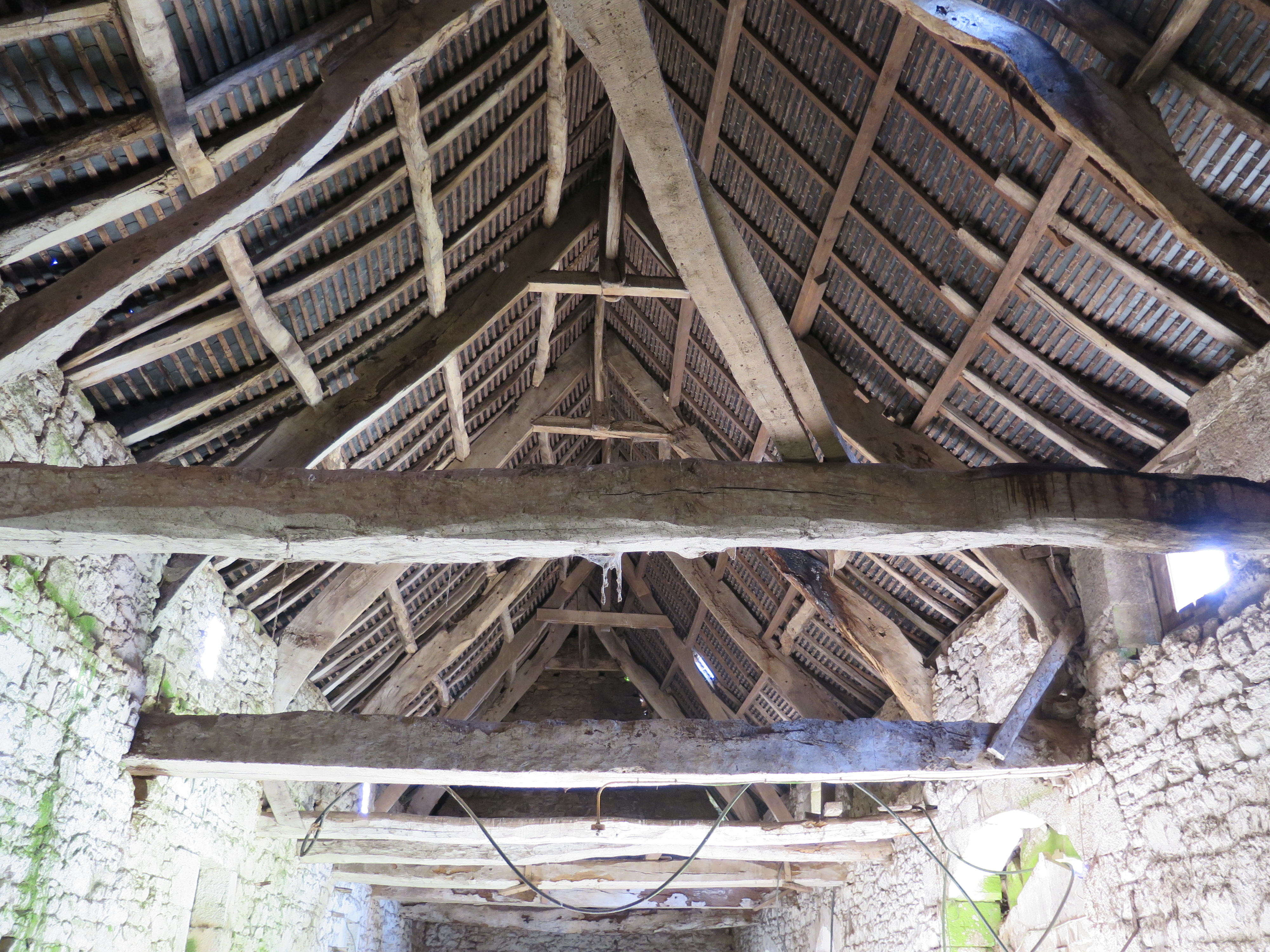 Plouaret, manoir de Guernanchanay : grange, vue de la charpenteImmatriculation