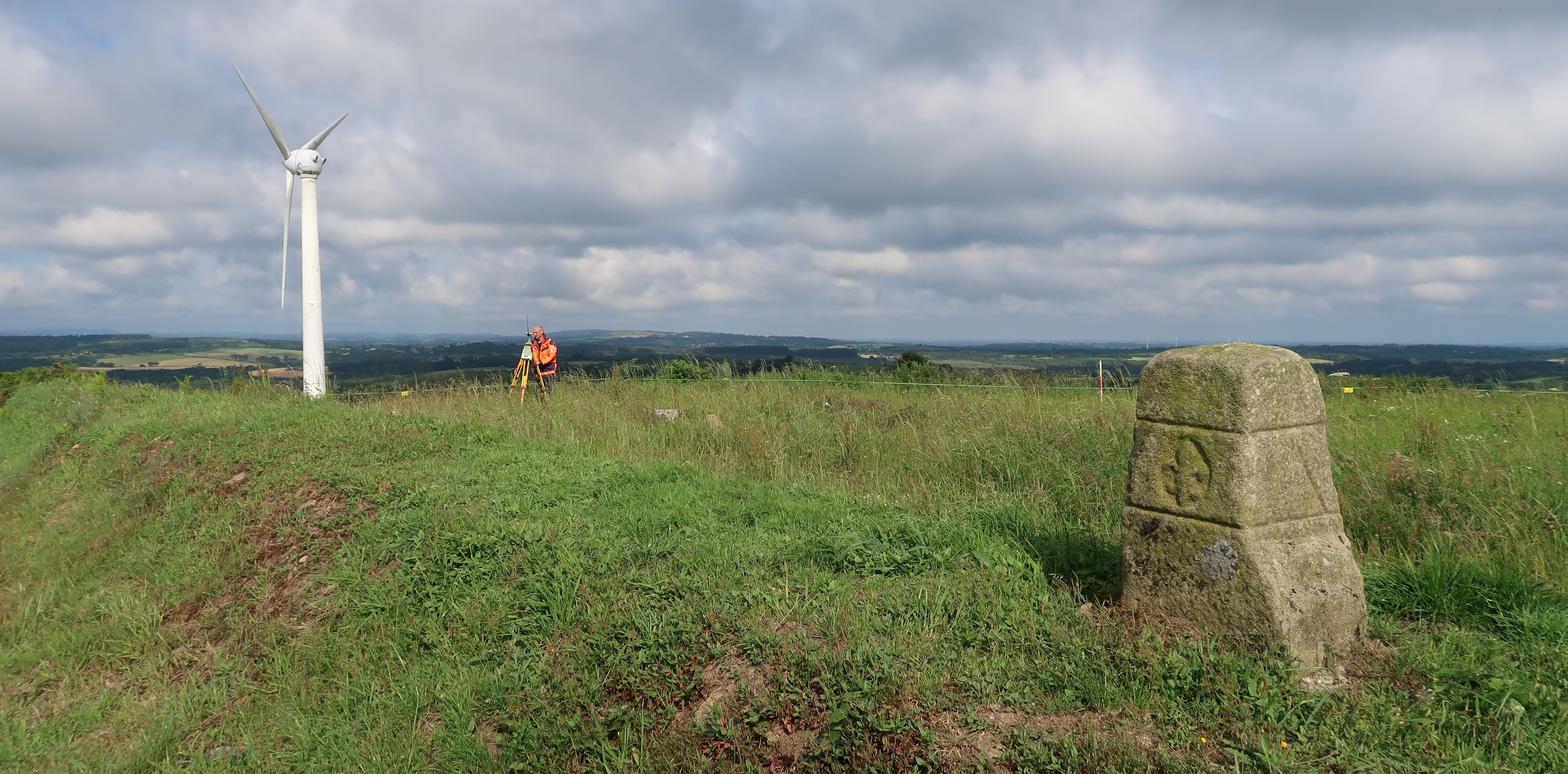 Borne n° 1, face sud ornée d'une fleur de lys, état en 2019. En arrière-plan, géomètre au travail et éolienne ouestImmatriculation