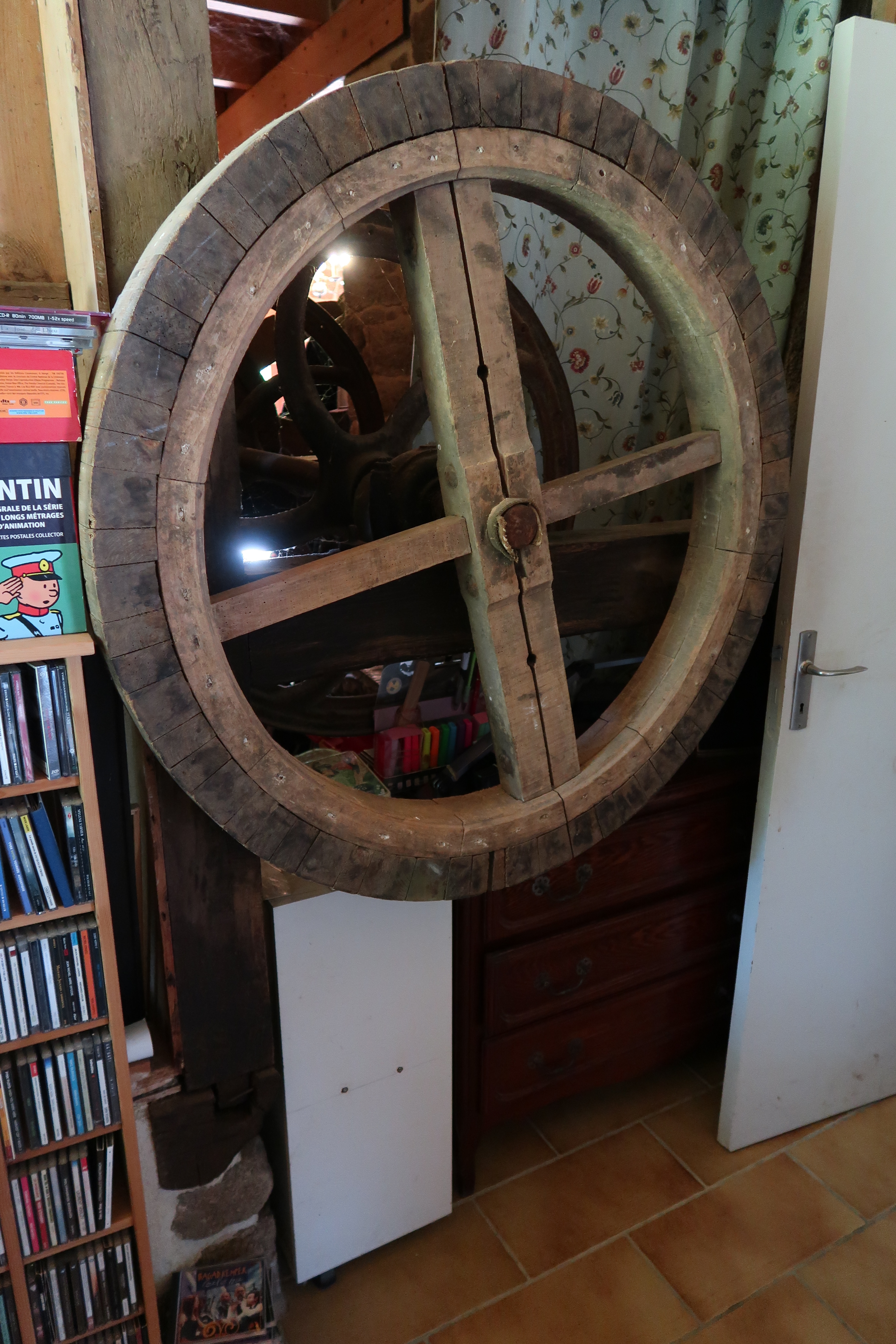 Rez-de-chaussée surélevé : détail de la roue de la broyeuse (broyeuse mise en dépôt au Musée d'art et d'histoire de Saint-Brieuc)Immatriculation